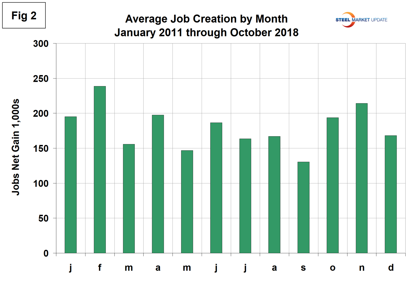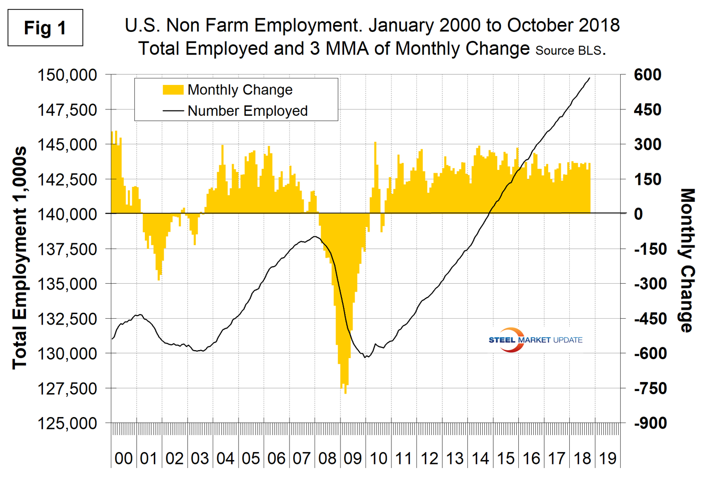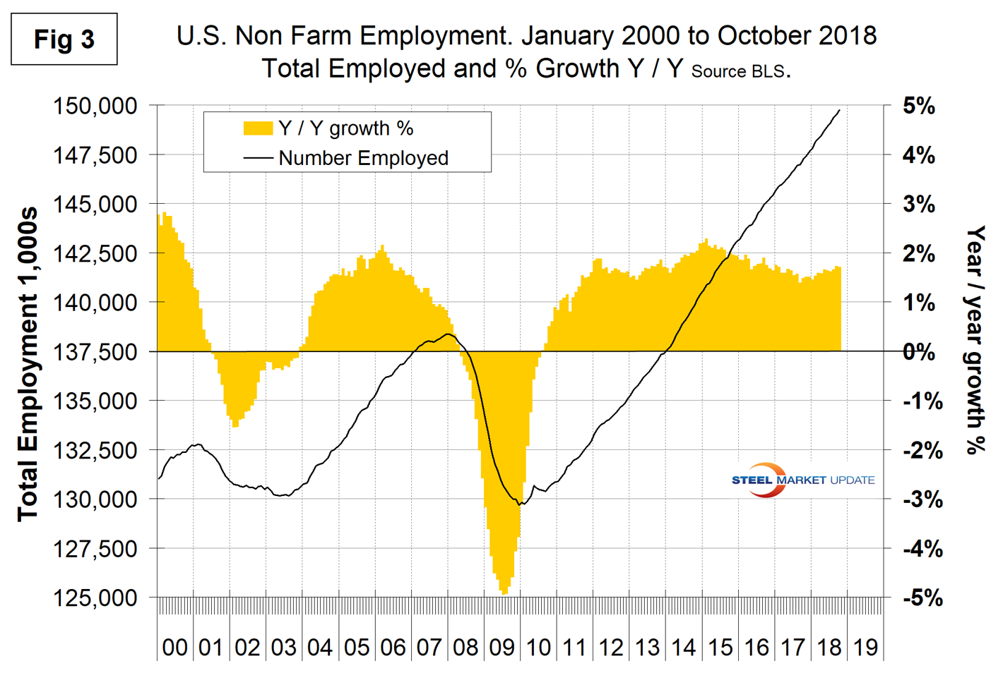 Rising employment and wages are the main contributor to GDP growth because personal consumption accounts for almost 70 percent of GDP. Steel consumption is related to GDP; therefore, this is one of the indicators that helps us understand the reality of the steel market. Net job creation in October as reported by the BLS on Friday was 250,000. September was revised down by 16,000 and August revised up by the same number.