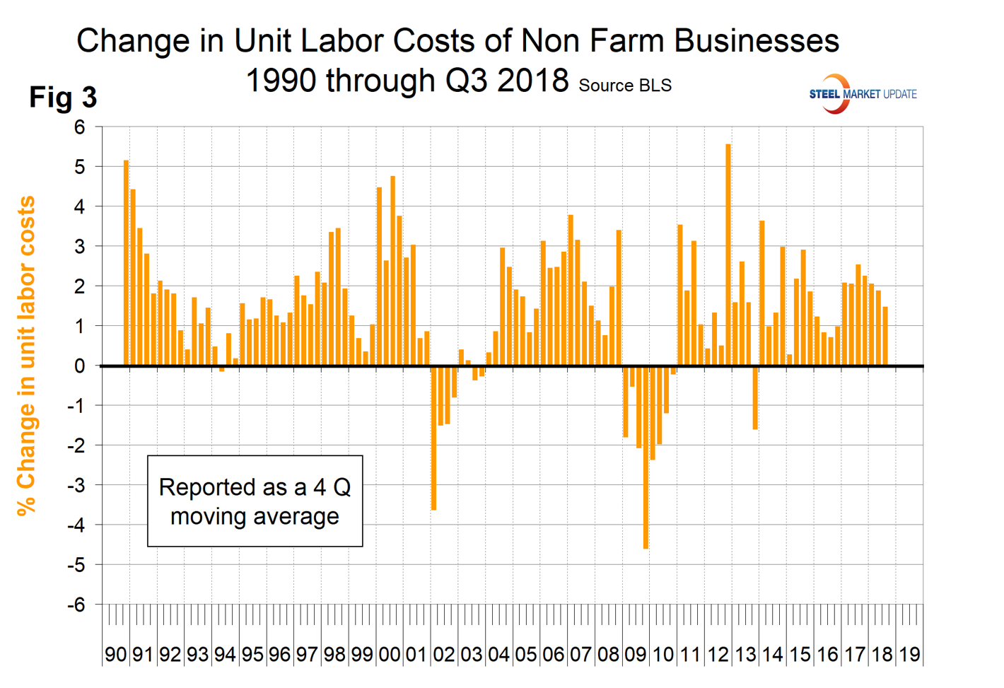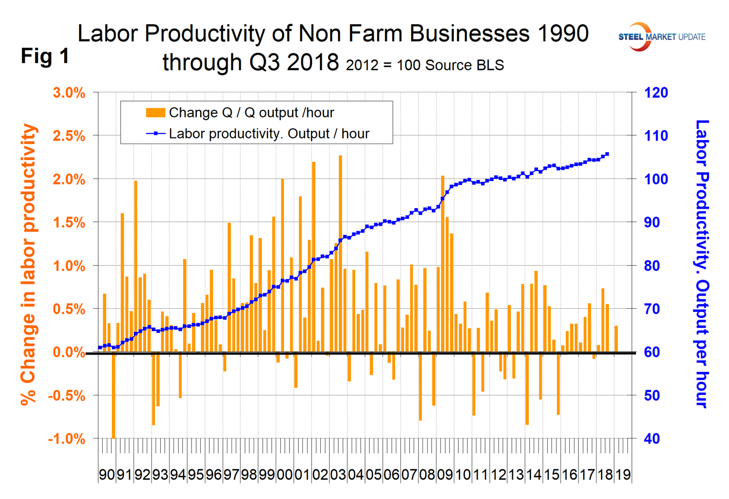 Unit labor costs and productivity changes are reported quarterly by the BLS and results for Q3 2018 were released last week. All quarterly percent changes in this release are seasonally adjusted annual rates. This basic information is useful to better understand the steel market. One way of looking at GDP is that it is the growth of the working age population multiplied by their productivity. Steel consumption is correlated with the growth of GDP.