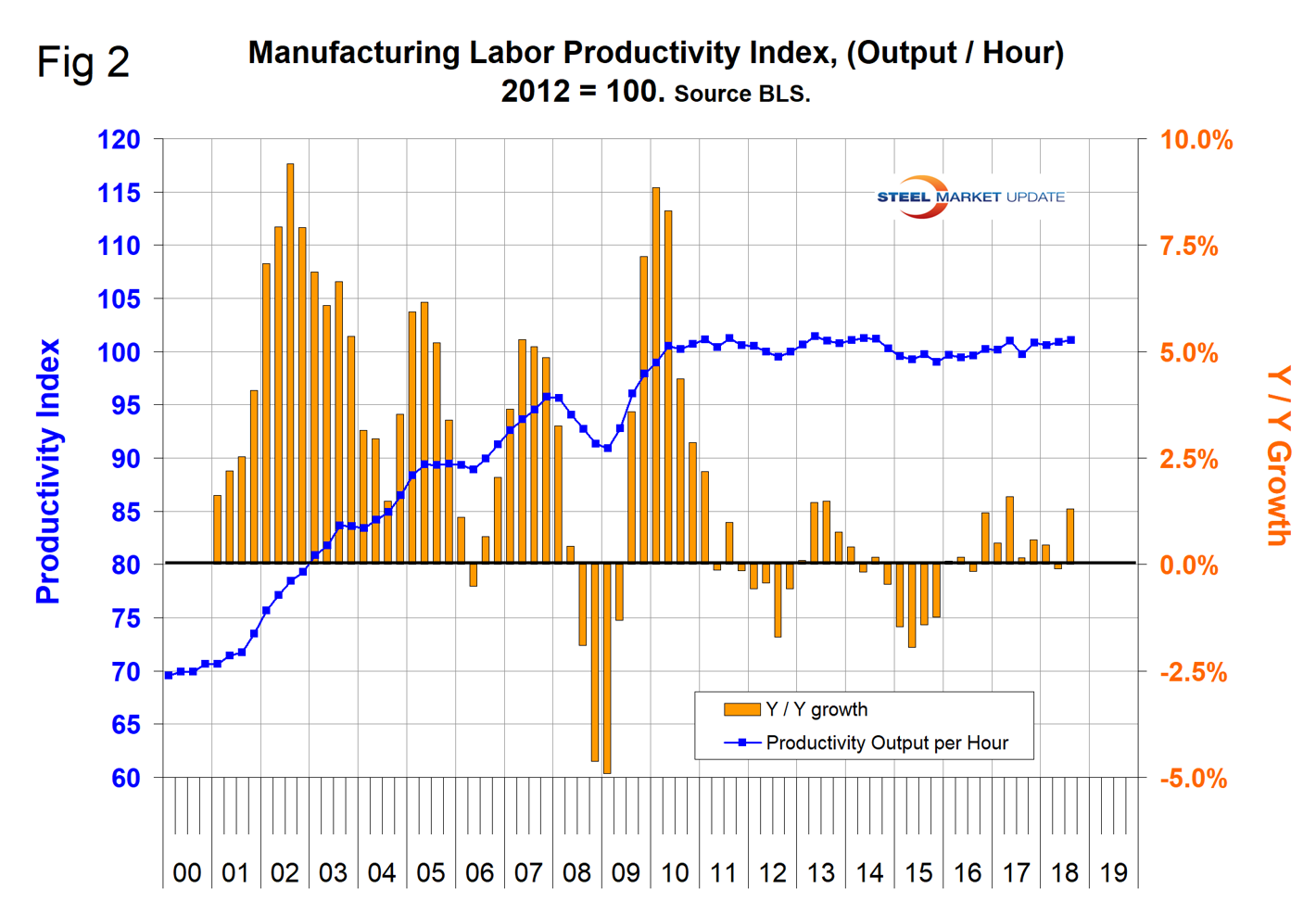 Labor productivity grew by 0.5 percent in the third quarter of 2018. The average of the last three quarters has been 0.3 percent. Unit labor costs increased 1.2 percent year over year, according to Steel Market Update’s latest analysis of Bureau of Labor Statistics (BLS) data.