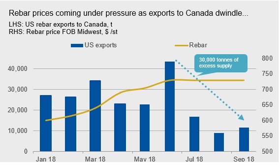 Rebar prices came under pressure this month after reciprocal Canadian duties on imports of U.S. steel resulted in a short-term supply buildup in the northeastern U.S.