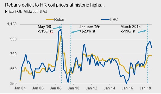 At the same time, the spread between rebar and HR coil has expanded far beyond its historical average after flat product price increases outpaced those for long products.