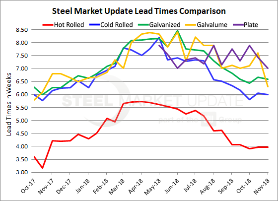 Lead times for Galvalume and plate products shortened up a bit in the past two weeks, but otherwise lead times for flat rolled products have seen little change in October or November, despite the price hike announcements by the major mills.