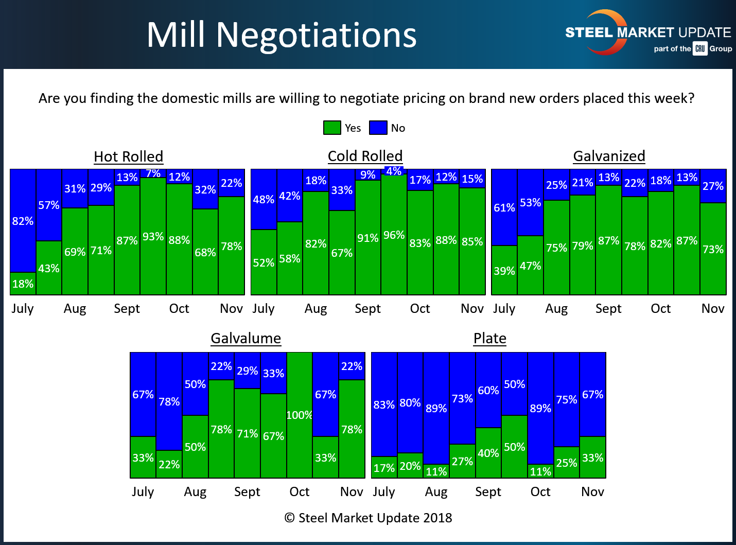 Steel Market Update tracks how buyers and sellers of flat rolled steel characterize price negotiations with the mills. In the hot rolled category, 78 percent of buyers said they have found mills willing to talk price, up from 68 percent in mid-October. Only about 22 percent say the mills are now holding the line on HR.