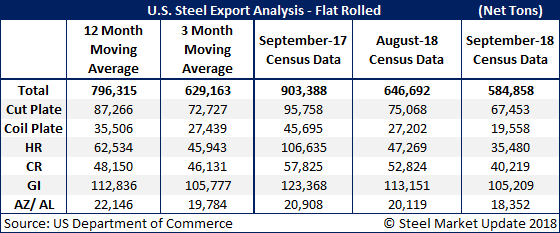 The total September export figure is below both the three-month moving average (average of July 2018, August 2018 and September 2018) and the 12-month moving average (average of October 2017 through September 2018). That is also the case for each flat rolled and plate product in the table below. Here is a breakdown by product: