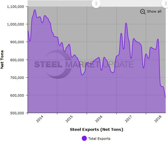 Hot rolled steel exports fell 24.9 percent month over month to 35,480 tons, and were down 66.7 percent from September 2017 levels, also to the lowest level SMU has recorded.
