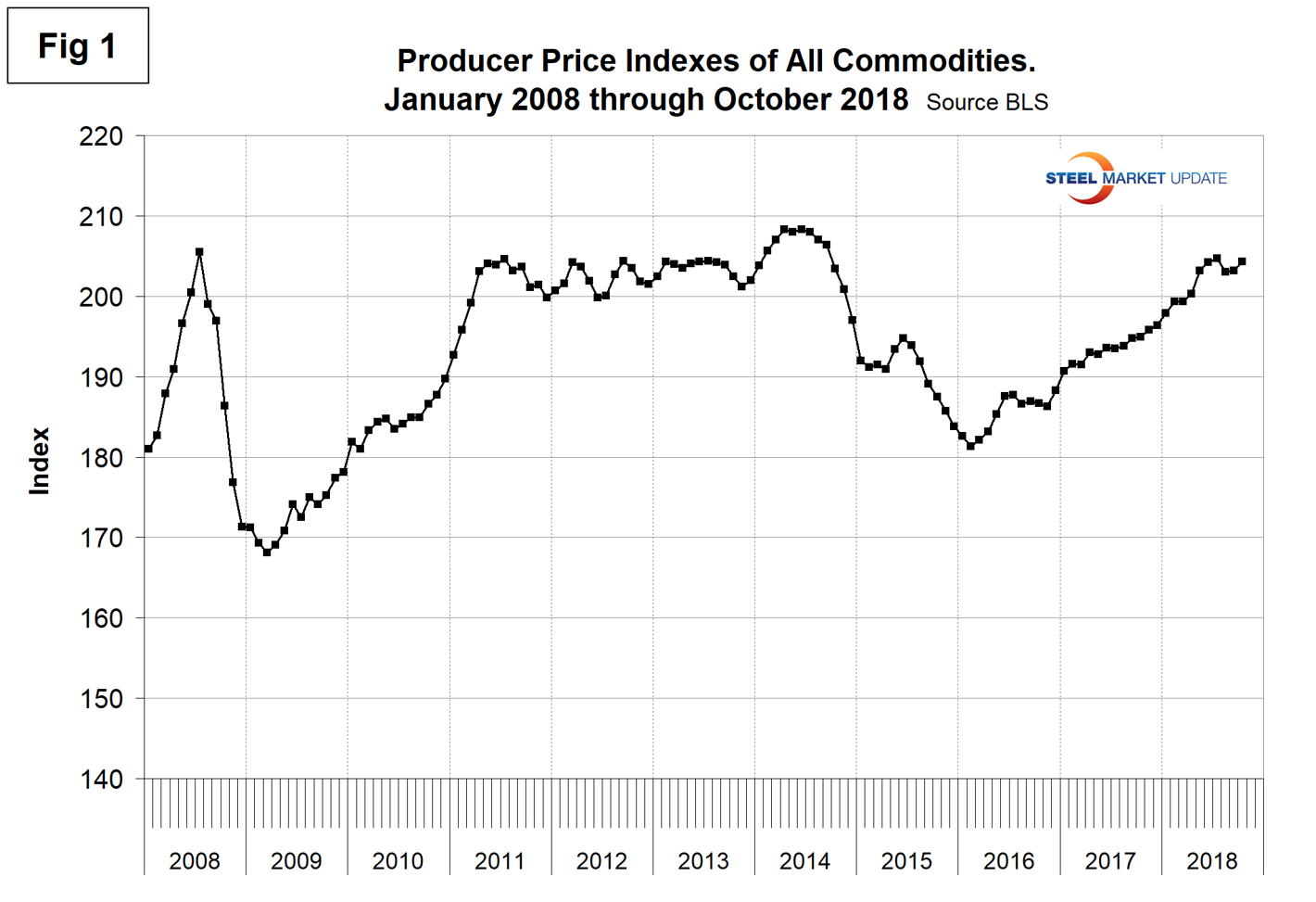Last week, the Bureau of Labor Statistics (BLS) released its series of producer price indexes (PPIs) for more than 10,000 goods and materials through October. For an explanation of this program, see the end of this piece. The PPI data are helpful in monitoring price direction, and compared with known transaction prices are a reasonable representation of the real world, though there may be a lag between the BLS reports and spot prices for steel products. The actual index values of the PPIs of different products cannot be compared with one another because they are developed by different committees within the BLS. We believe this data is useful in comparing the direction of prices in the short and medium term, but tell us nothing about the absolute value.