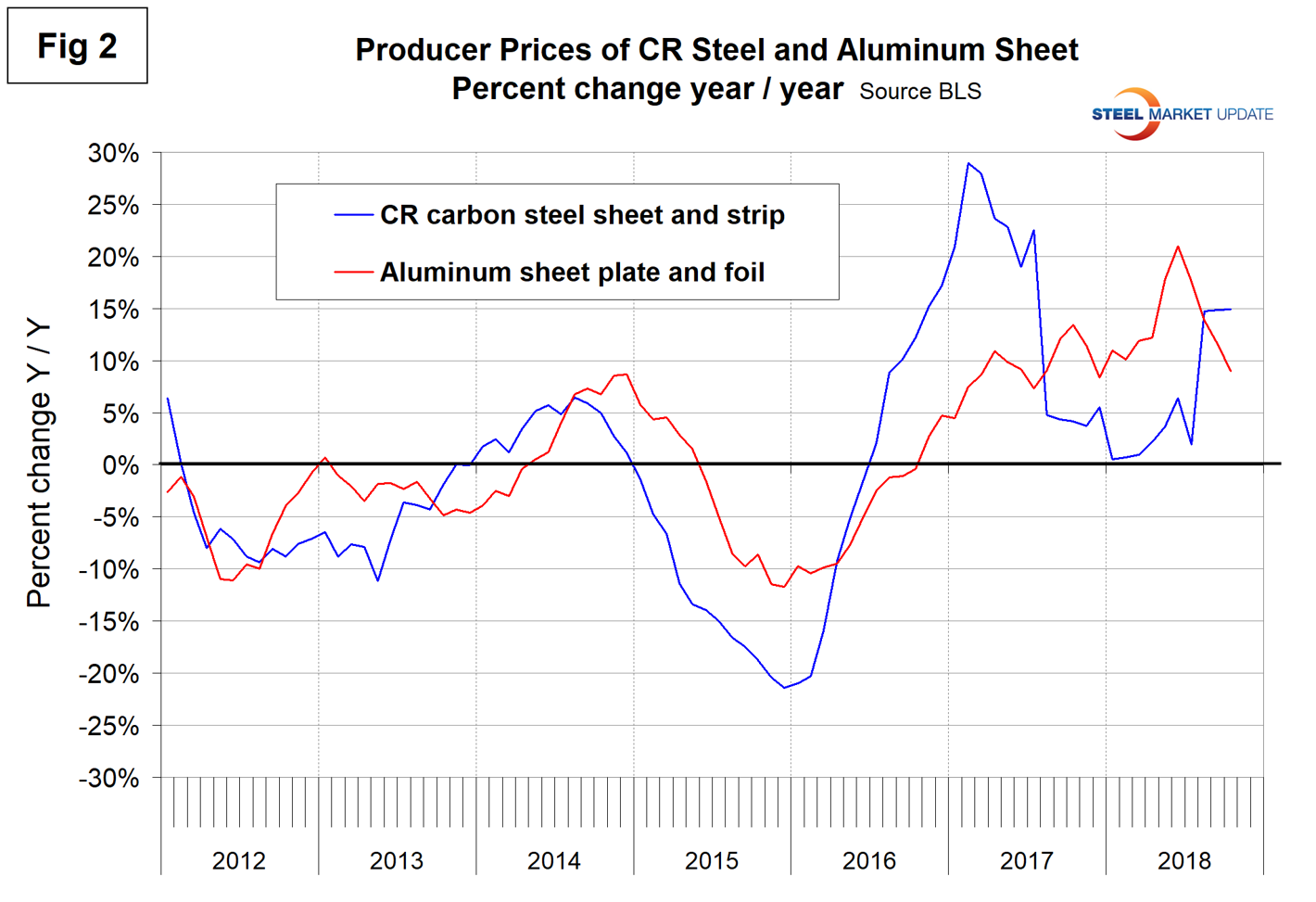 Figure 2 shows the year-over-year comparison of the price change of cold rolled steel sheet and flat rolled aluminum. In the 12 months August 2017 through July 2018, aluminum prices escalated faster than steel. In the three months through October 2018, the situation reversed.