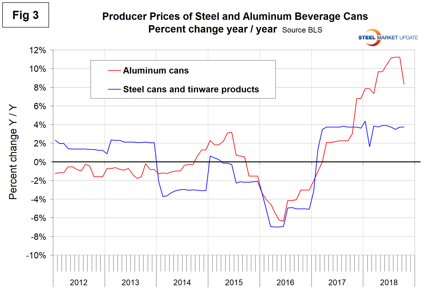 Figure 3 shows the same comparison for steel cans and tinware products and aluminum cans. There is a lag between price changes of sheet and the price change of cans. We can expect steel cans to lose ground against aluminum in the next few months.
