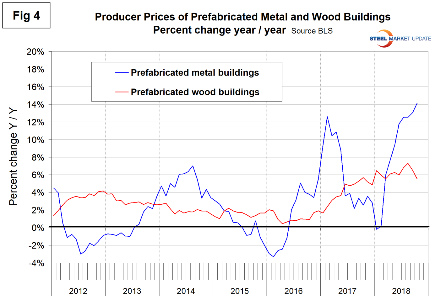 Figure 4 compares prefabricated metal with prefabricated wood buildings. From mid-2017 through February 2018, the price of wood buildings escalated faster than steel, but since then there has been an abrupt change to the detriment of steel’s competitive position.