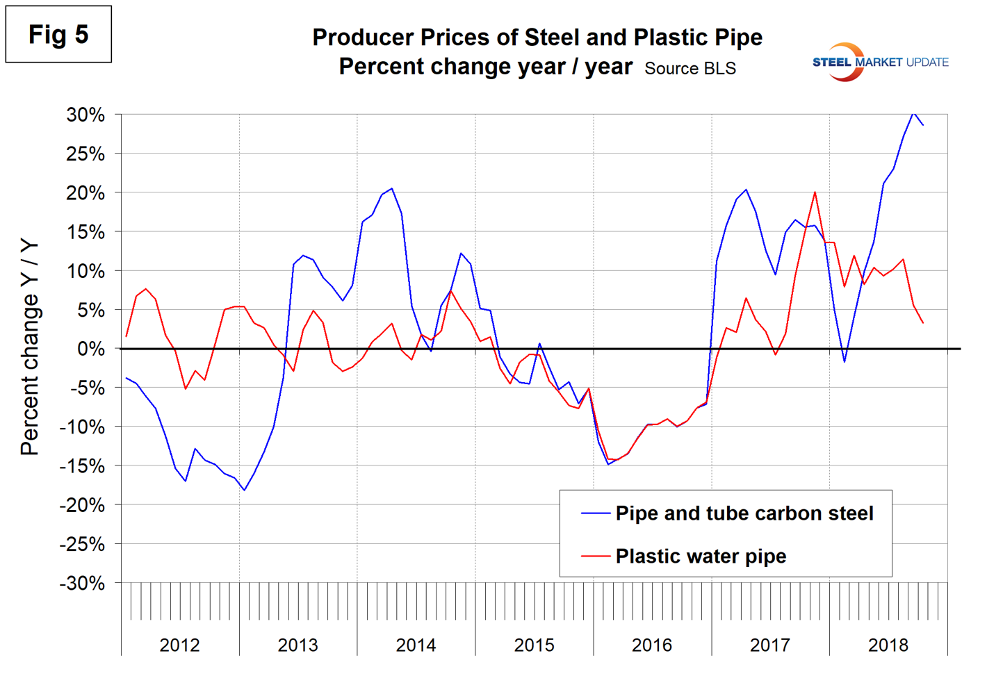 Figure 5 compares steel and plastic pipe. Carbon steel pipe is currently experiencing a high rate of price escalation, but plastic pipe has been trending down in 2018.