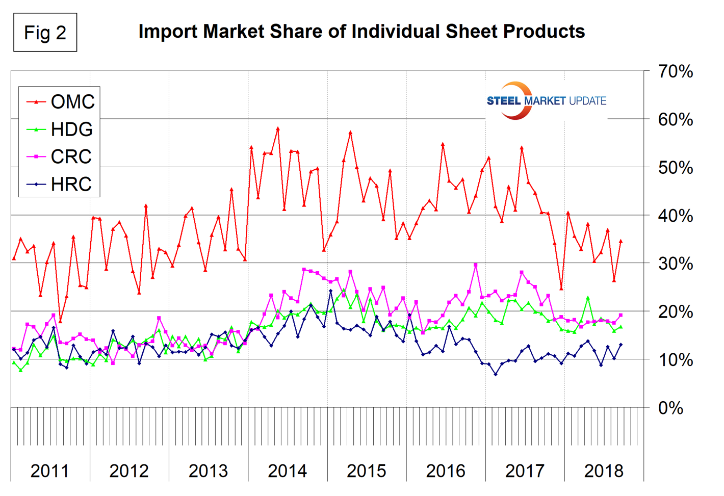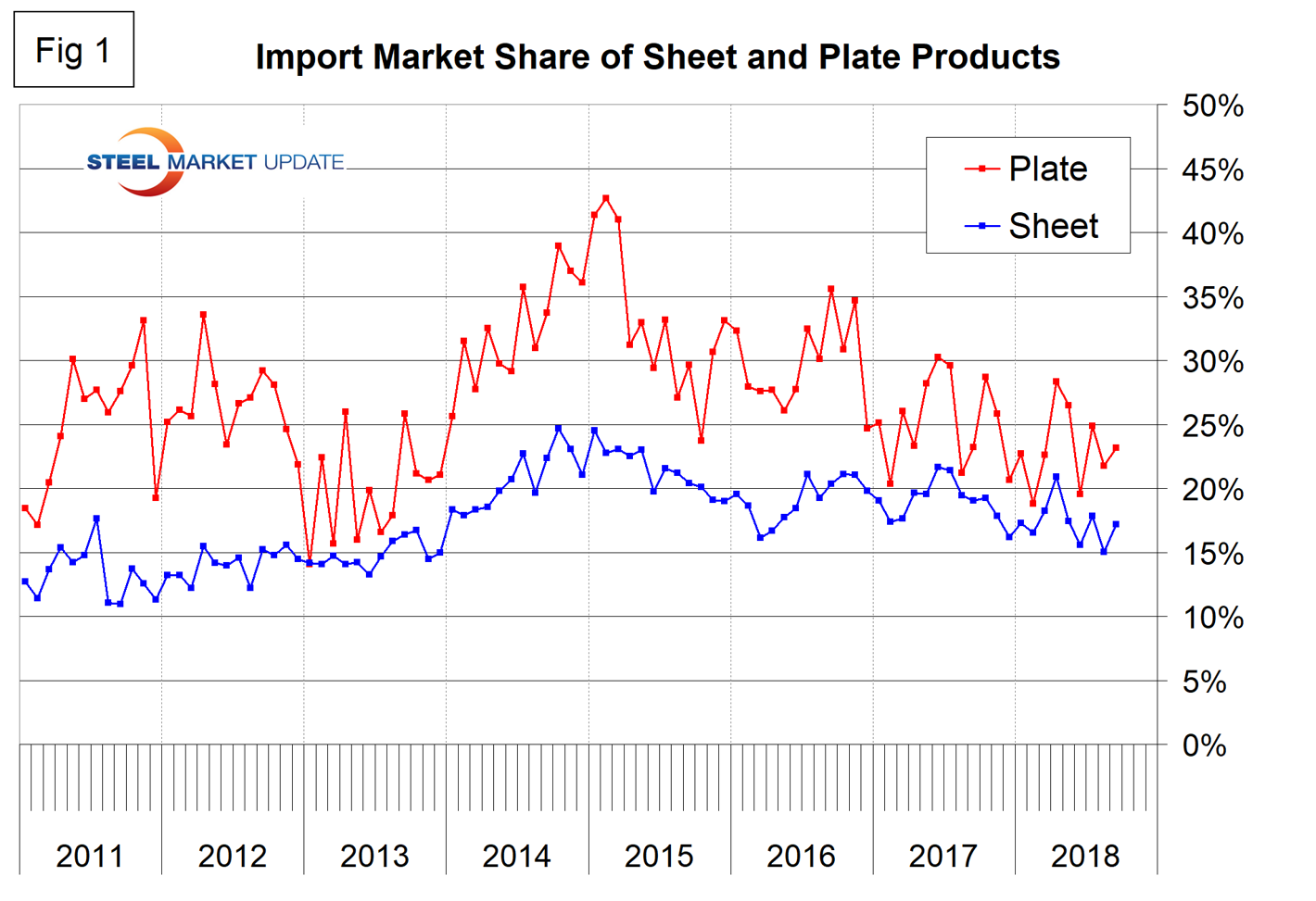 Figure 1 shows the historical import market share of plate and total sheet products. The import share of plate has been decreasing erratically for three years. Excluding the spike of April, the import share of sheet products hasn’t changed much in 10 months.