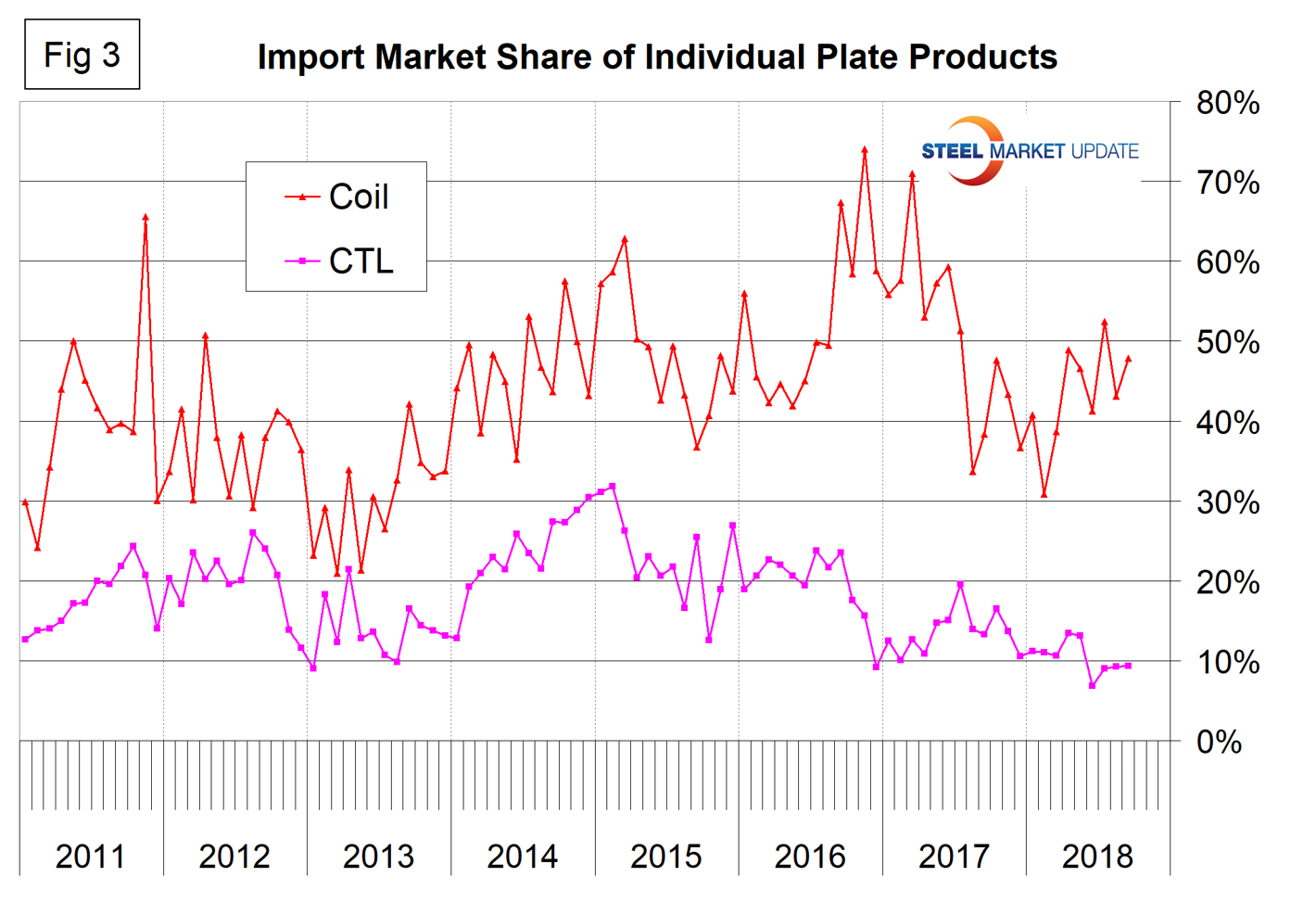 Figure 3 breaks out coiled and CTL plate from the total and shows that coil imports currently have more than four times the market share of CTL imports.