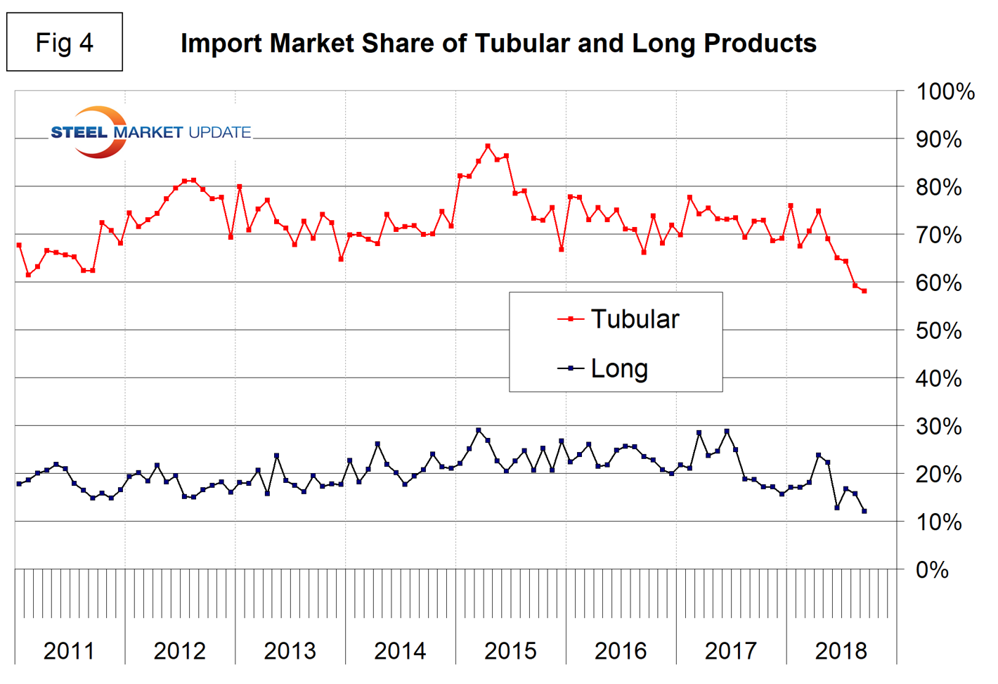 Figure 4 describes the total import share of tubular goods and long products. It is evident that data for the domestic production of tubulars is much less reliable than for other products. Domestic shipments are definitely understated for some products and we suspect for all. This is probably because of a more fragmented supply chain and the independent tubers not reporting to the extent that the steel mills do for other products. This has the result of increasing the apparent import market share.