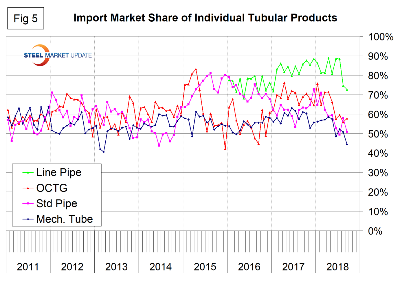 Figure 5 shows the import market share of the individual tubular products. Based on the available information, all are very high compared to other steel product groups, and line pipe is the highest.