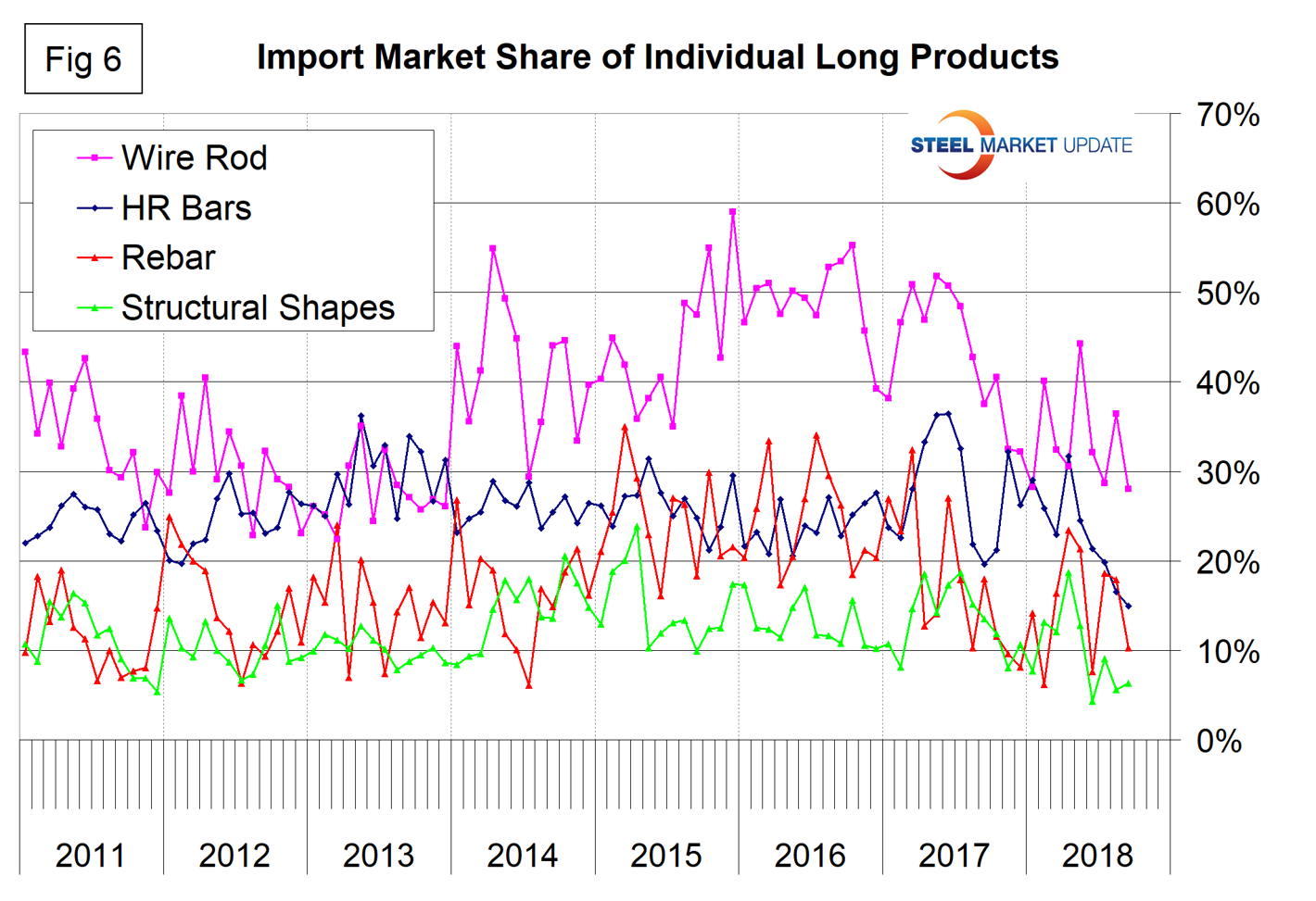 Figure 6 shows the detail for the four major sectors of the long products group. The import share of longs—with the exception of the April-May spike—has been declining for over a year. Wire rod historically has had by far the highest import share, and to make matters worse the imports of drawn wire are also very high. The highest volume item of Chinese steel imports to the U.S. is currently value-added drawn wire.