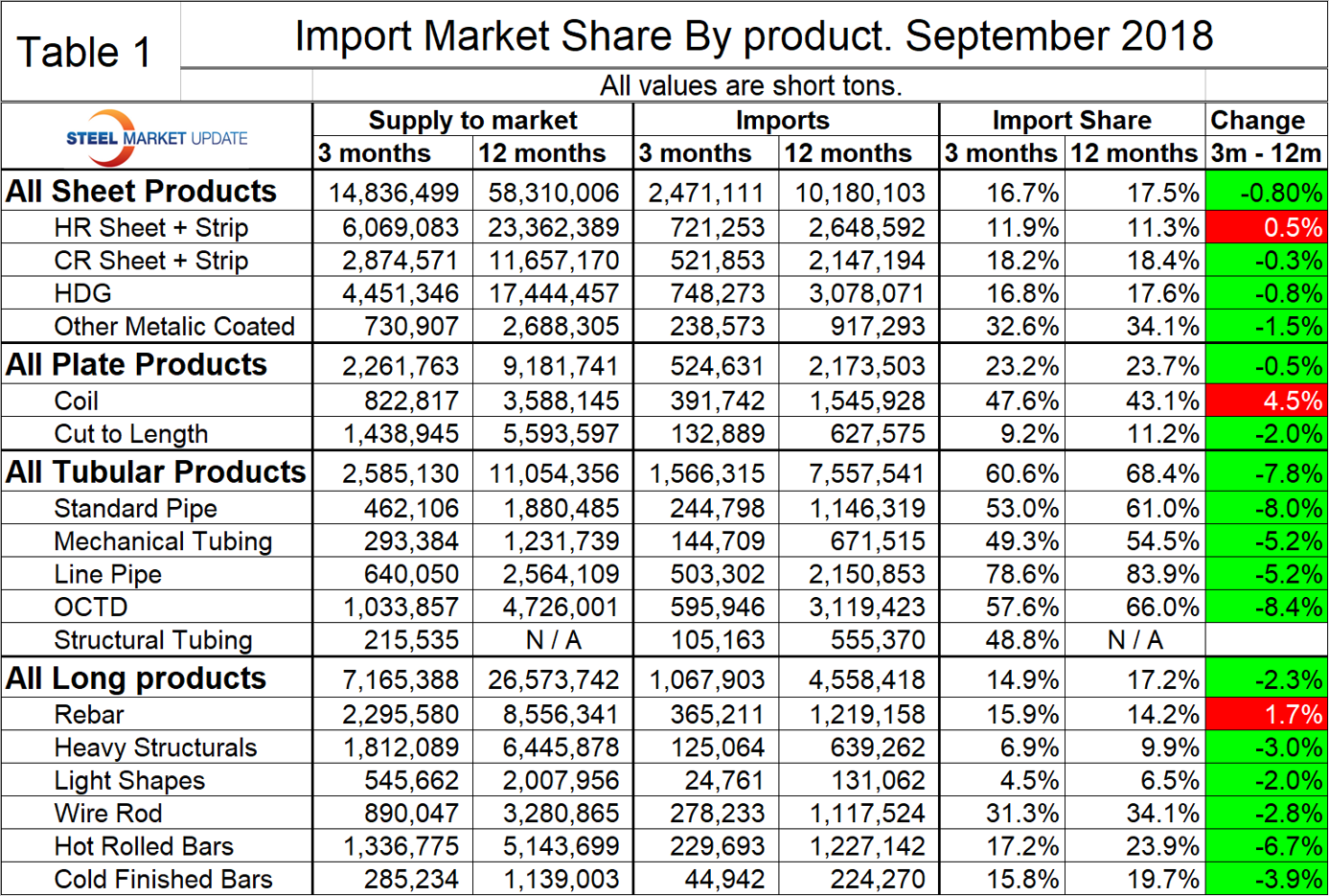 This report examines the import share of sheet, plate, long and tubular products and 16 subcategories through September.