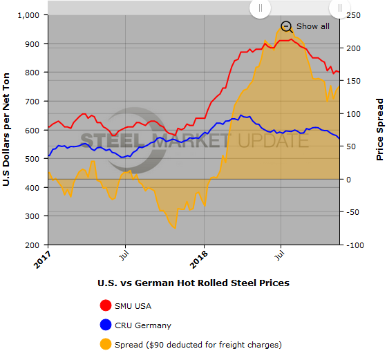 As of Wednesday, Nov. 14, the CRU German HRC price was $568 per net ton, down $12 from the previous week and down $15 from two weeks prior. Adding $90 per ton for import costs, that puts the price at $658 per ton from Germany delivered to the U.S. The latest Steel Market Update hot rolled price average is $800 per ton for domestic steel, down $5 over last week, but up $5 from two weeks ago. The spread between German and U.S. HR prices is now +$142 per ton, up from +$135 last week, and up from +$122 two weeks ago. That means domestic HR is now theoretically $142 per ton more expensive than importing HR steel from Germany. The four-week average price spread is now +$135 per ton, up $6 from last week.