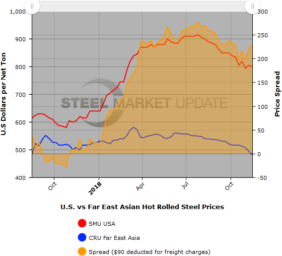 The CRU Far East HRC price fell $13 over last week to $481 per net ton, down $27 from two weeks prior. Adding import costs, that puts the price at $571 per ton. The spread between the Far East and U.S. figure is +$229 per ton, up from +$221 last week, and up from +$197 from two weeks ago. That means domestic HR would theoretically be $229 per ton more expensive than importing steel from East or Southeast Asia. The four-week average price spread is now +$216 per ton, up $8 from last week.