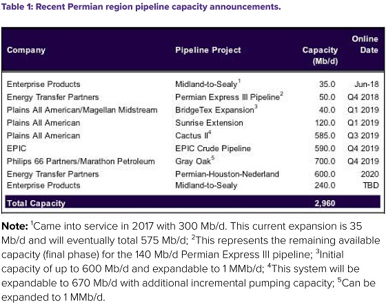 While these constraints are problematic and could result in some disruptions, the authors of this study believe the market has better-than-average odds of hitting a “goldilocks” outcome, one where there is just enough transportation capacity to meet the rising production from the region, but no more. This shorter-term optimism arises from two observations. First, a considerable number of major crude oil transportation projects have been announced to move production from the Permian to the Gulf Coast. In total, almost three million barrels per day of crude oil transportation capacity is expected to come online in the Permian region in the next two years. Second, there is a relatively good chance that the incremental transportation capacity increase will be enough to meet the 2020 production increase from the Permian basin.
