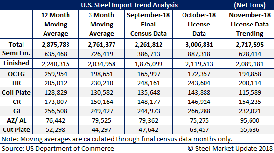 The U.S. Department of Commerce released updated license data on October and November foreign steel imports on Tuesday. The latest data shows October imports at just over 3 million net tons, well above the 2.3 million ton dip reported for the month of September. The majority of this change is due to an increase in semi-finished steels (mostly slabs going to domestic mills), up 500,000 tons between September and October. The latest trending data figure for November suggests total imports will be down to 2.7 million tons.