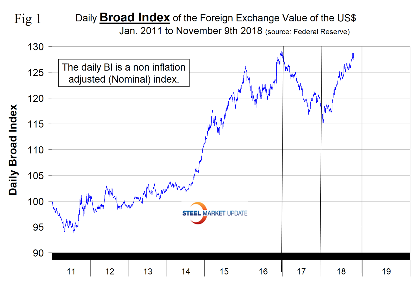 Explanation of Data Sources: The broad index is published by the Federal Reserve on both a daily and monthly basis. It is a weighted average of the foreign exchange values of the U.S. dollar against the currencies of a large group of major U.S. trading partners. The index weights, which change over time, are derived from U.S. export shares and from U.S. and foreign import shares. The data are noon buying rates in New York for cable transfers payable in the listed currencies. At SMU, we use the historical exchange rates published in the Oanda Forex trading platform to track the currency value of the U.S. dollar against that of 16 steel and iron ore trading nations. Oanda operates within the guidelines of six major regulatory authorities around the world and provides access to over 70 currency pairs. Approximately $4 trillion U.S. dollars are traded every day on foreign exchange markets.
