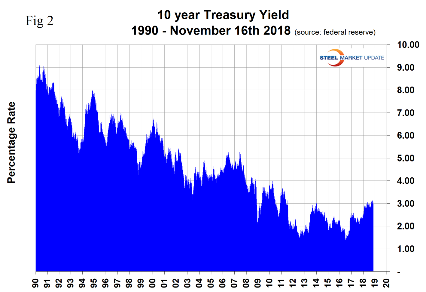 On Sept. 26, the Fed enacted its eighth rate hike of this cycle, which was universally expected and therefore priced into the dollar value at that time. Ever since the FOMC’s previous meeting in early August, federal-funds futures had implied odds of another hike at 91 percent to 100 percent at the September meeting. Figure 2 describes the 10-year treasury yield through Nov. 16 on which date the rate was 2.99 percent, down from a seven-year high of 3.17 percent on Nov. 8.