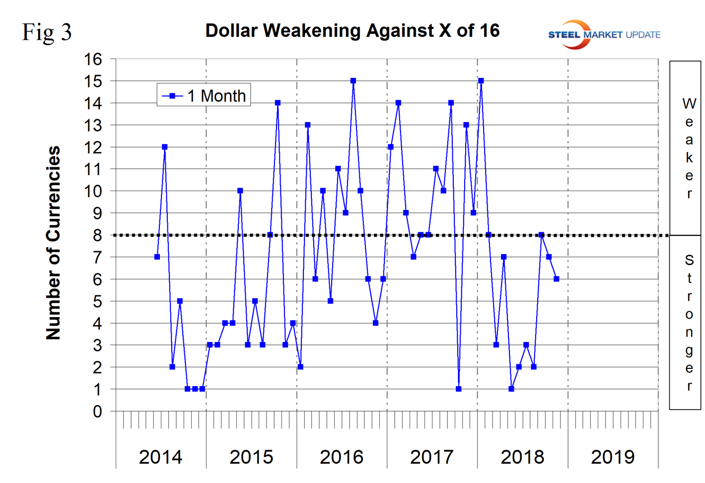 In the last month, the dollar weakened against six of the 16 currencies that Steel Market Update tracks. This was close to the performance we reported in each of the previous two months, but a dramatic change from the period May through August. In May, only one of the 16 appreciated against the dollar, in June only two, in July only three and in August just two. Please see the end of this report for an explanation of data sources.