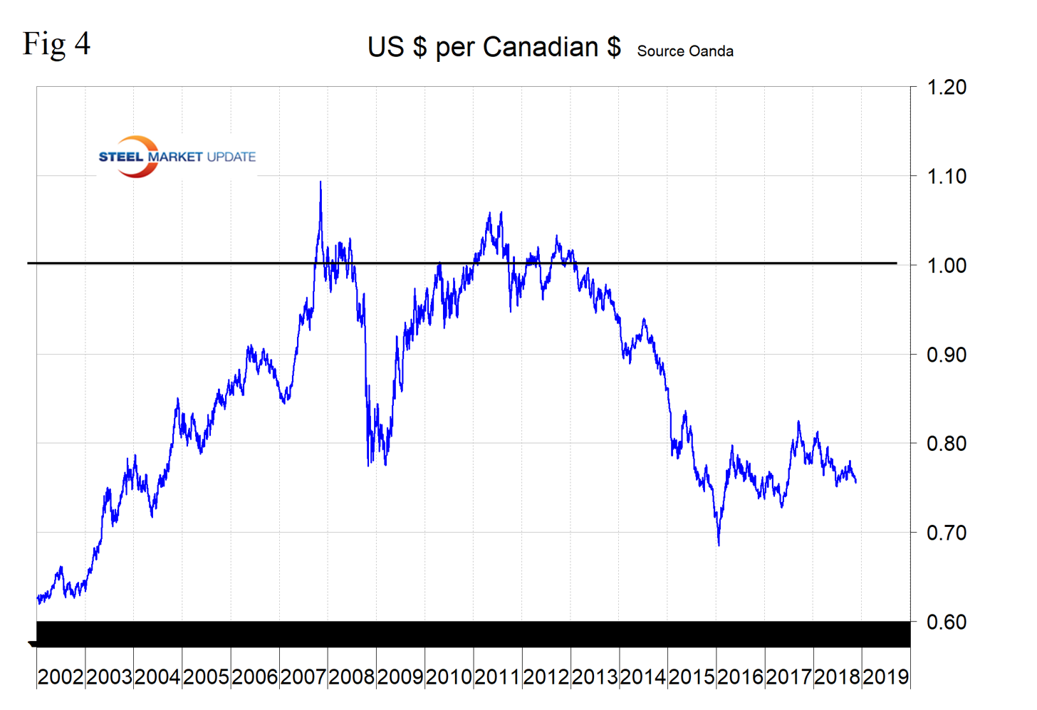Canada’s loonie has declined by 1.4 percent against the U.S. dollar in the last month (Figure 4). On Nov. 13, currency analyst Kenny Fisher wrote: “Nervousness and uncertainty on the part of investors is never good news for the Canadian dollar, as the minor currency is dependent on risk appetite. With global stock markets seeing red over the past few days, the Canadian currency has fallen out of favor. The Bank of Canada has taken a page out of the Federal Reserve’s book, saying that its policy of gradual rate hikes will continue into 2019. The BoC will have to continue raising rates if the Canadian dollar is to hold its own against the strong U.S. dollar.”