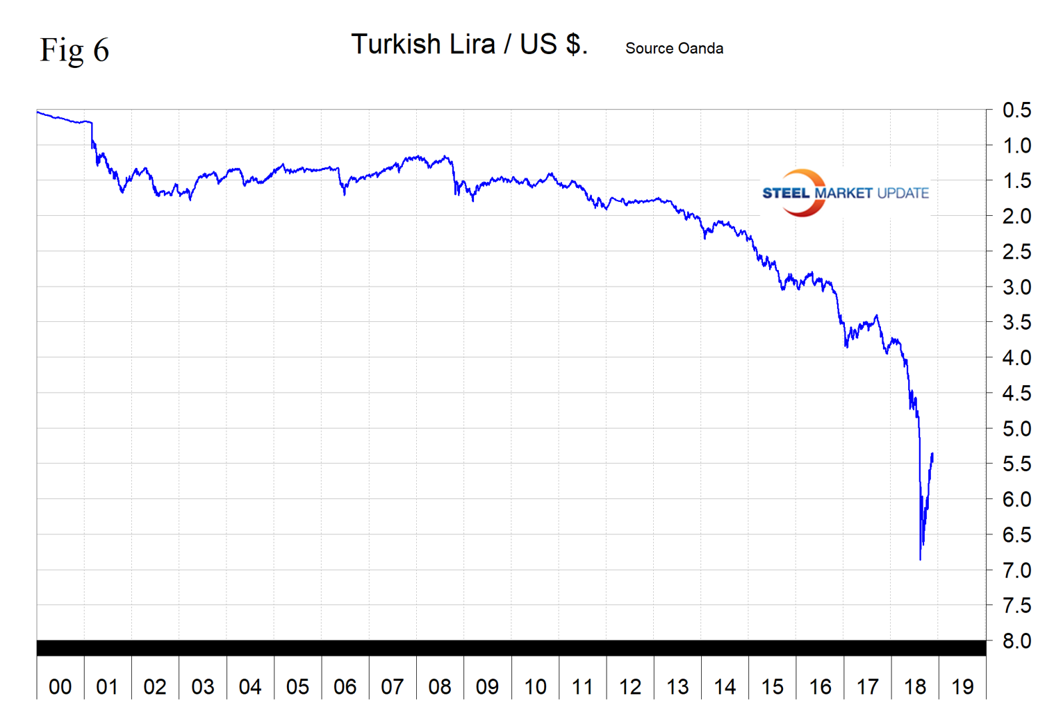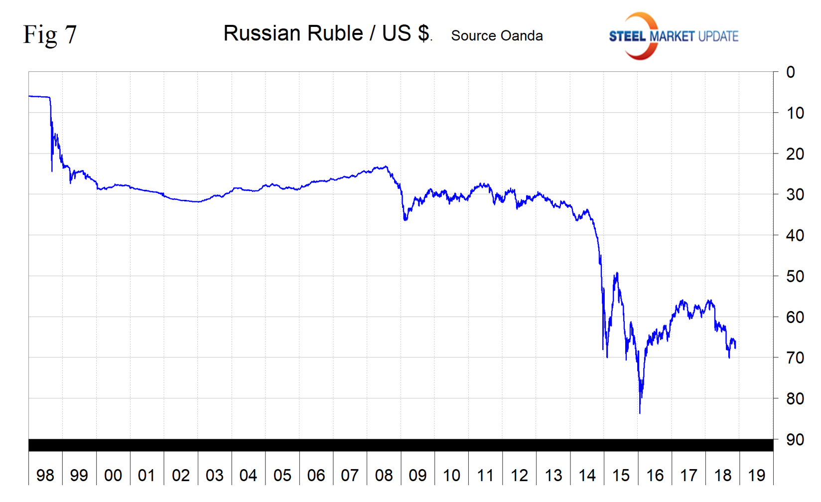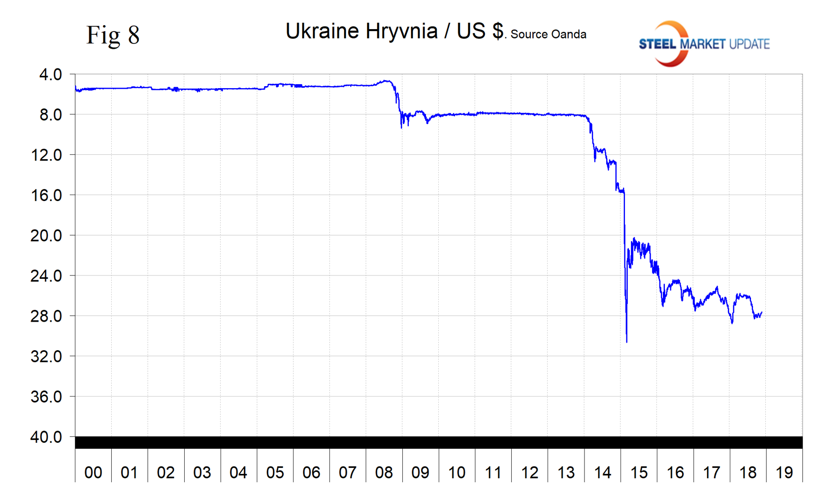 In each of these reports, we comment on several of the 16 steel and iron ore trading currencies listed in Table 1 and over a period of several months will describe the history of all of them. Charts for each of the 16 currencies are available through Oct. 14 for any premium subscriber who requests them.
