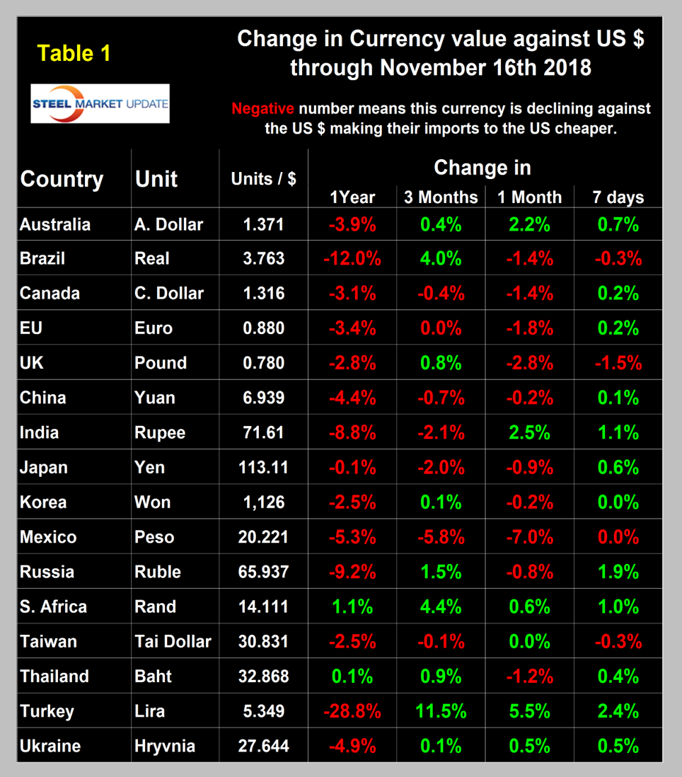 Each month, SMU publishes an update of Table 1, which shows the value of the U.S. dollar against the currencies of 16 major global steel and iron ore trading nations. The table shows the change in value in one year, three months, one month and seven days through Nov. 16. Currencies that weakened against the U.S. dollar are color coded in red. Green indicates currencies that strengthened against the U.S. dollar. November was the third month in which there was a progression of the dollar weakening moving to shorter time frames. In the last seven days, the dollar weakened against 12 of the 16.