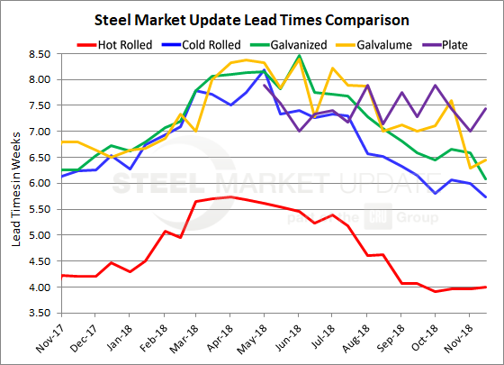 The current lead time for galvanized steel is 6.09 weeks, down from 6.66 weeks a month ago. Lead times on galvanized orders extended as far as 8.46 weeks earlier this summer.