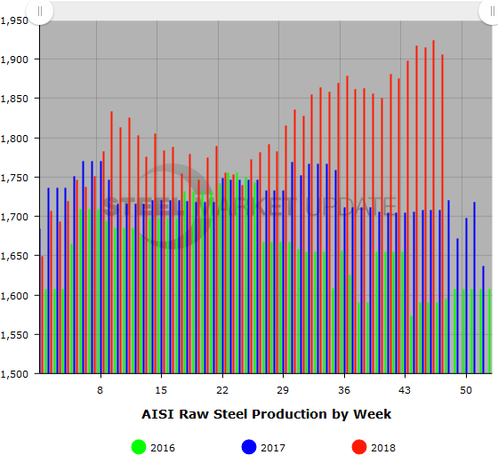 U.S. steelmakers have produced 5.6 percent more raw steel so far this year. Adjusted year-to-date production through Nov. 24 totaled 85,639,000 net tons. The increase is the result of a nearly 4 percent improvement in capacity utilization, to an average annual rate of 78.1 percent from 74.2 percent in 2017, reports the American Iron and Steel Institute.