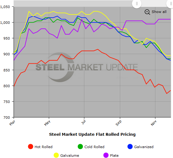 SMU Note: Below is a graphic showing our hot rolled, cold rolled, galvanized, Galvalume and plate price history. This data is available here on our website with our interactive pricing tool. Note that plate prices are not yet available on our website, but we are in the process of adding that dataset. If you need help navigating the website or need to know your login information, contact us at info@SteelMarketUpdate.com or 800-432-3475.
