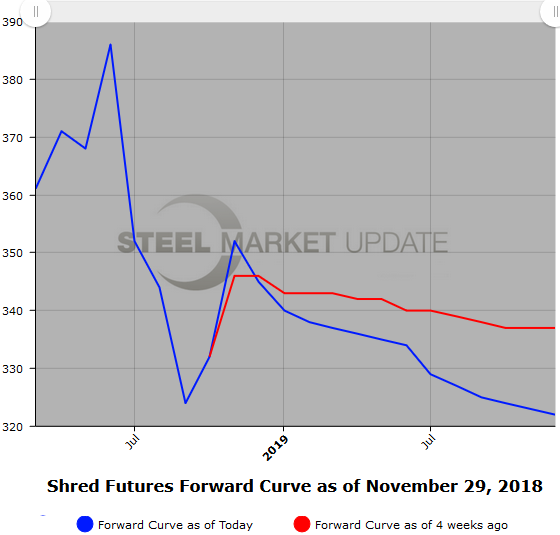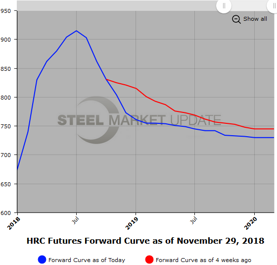 HR spot prices continued to fall this week breaking down through the $800/ST [$40/cwt] level. The HR futures followed suit. Futures prices have been under some selling pressure all month as the curve has shifted lower with Q1’19 HR declining about $49/ST [$2.45/cwt], Q2’19 HR declining about $30/ST [$1.50/cwt] and 2H’19 HR declining about $23/ST [$1.15/cwt]. Cal’19 HR for Nov. 1 was settled at $774/ST [$38.70/cwt] as compared to Nov. 28 at $744/ST [$37.20/cwt]. While the price curve for Cal’19 HR has shifted lower, it is also worth noting that the backwardation between Jan’19 and Dec’19 has shrunk from $67/ST [$3.35/cwt] to $24/ST [$1.20/cwt] based on a comparison of the CME settlements for Nov. 1. and Nov. 28. The flatter forward curve is due to reduced interest by sellers to sell the latter half of Cal’19 at the same discount to the front end of the curve as early November, which could be a signal that the market participants think the HR market is getting near to a medium term low for prices.