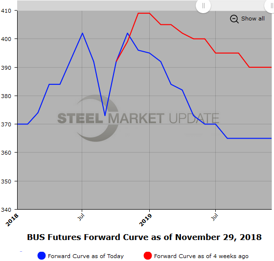 Scrap prices have softened from early strength in November. Early BUS chatter had scrap prices holding steady to slightly higher, however softer HR prices have pressured BUS prices via the metal margin and softer global HR prices. Nov’19 BUS settled at $402/GT and near end BUS prices were trading close to that level until recently. The Cal’19 BUS curve has come under some pressure on light trading. As a comparison, Nov. 1 Q1’18 BUS settlement was $406.33/GT versus Nov. 28 settlement, which was $385.33/GT a $21/GT decline. The backwardation in the Cal’19 BUS curve has gotten steeper since the beginning of November. It has increased from $19/GT back to $28/GT back. The Cal’19 last is roughly $374/$385 per GT dropping from $383/$395 per GT in the last two weeks.