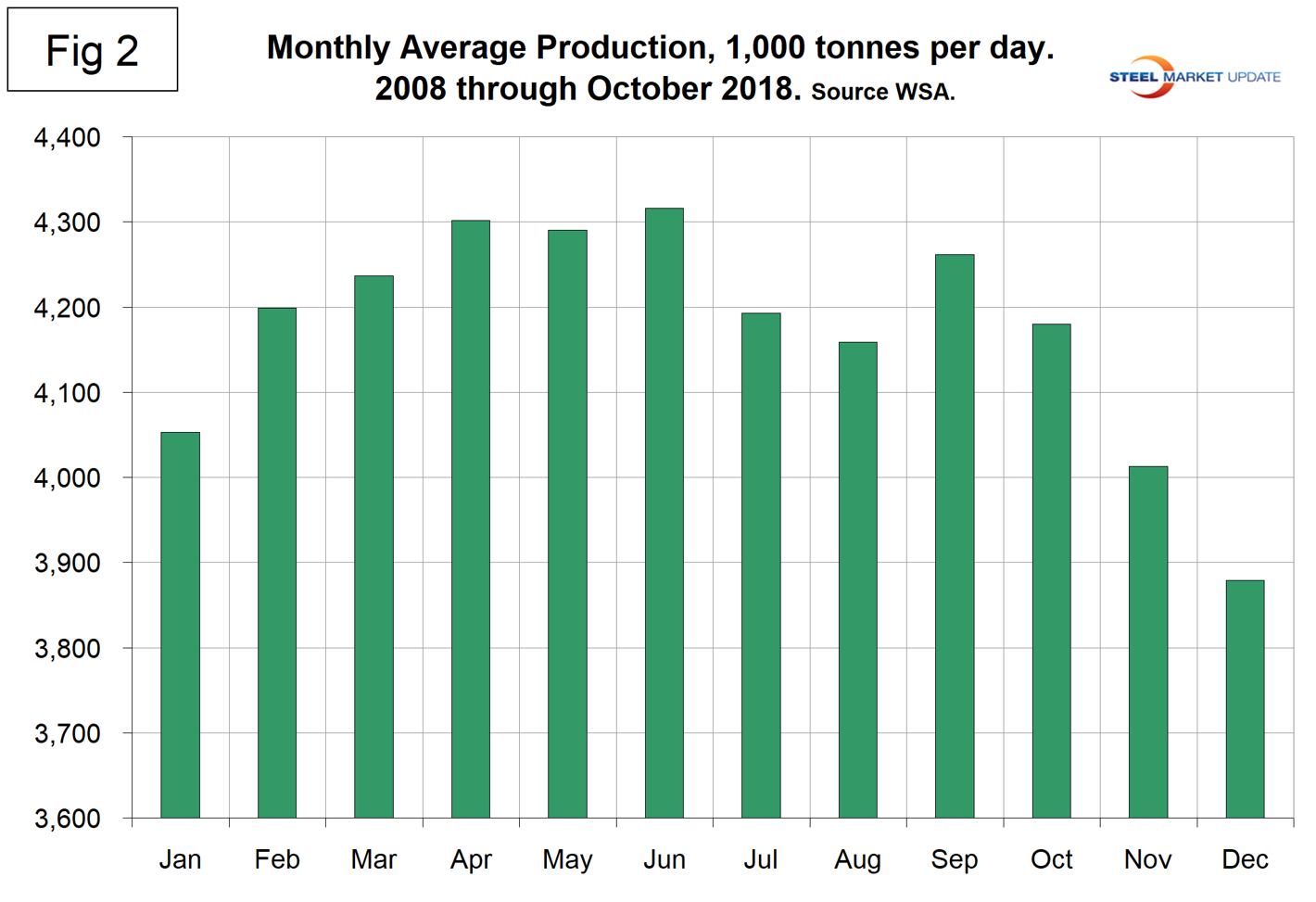 On average, global production on a tons-per-day basis peaked in the early summer in the years 2010 through 2016, but last year the second half downtrend was delayed until November and in 2018 there is still no sign of a slowdown. Figure 2 shows the average tons per day of production for each month since 2008. On average, October declined by 1.92 percent. This year, October increased by 0.1 percent.