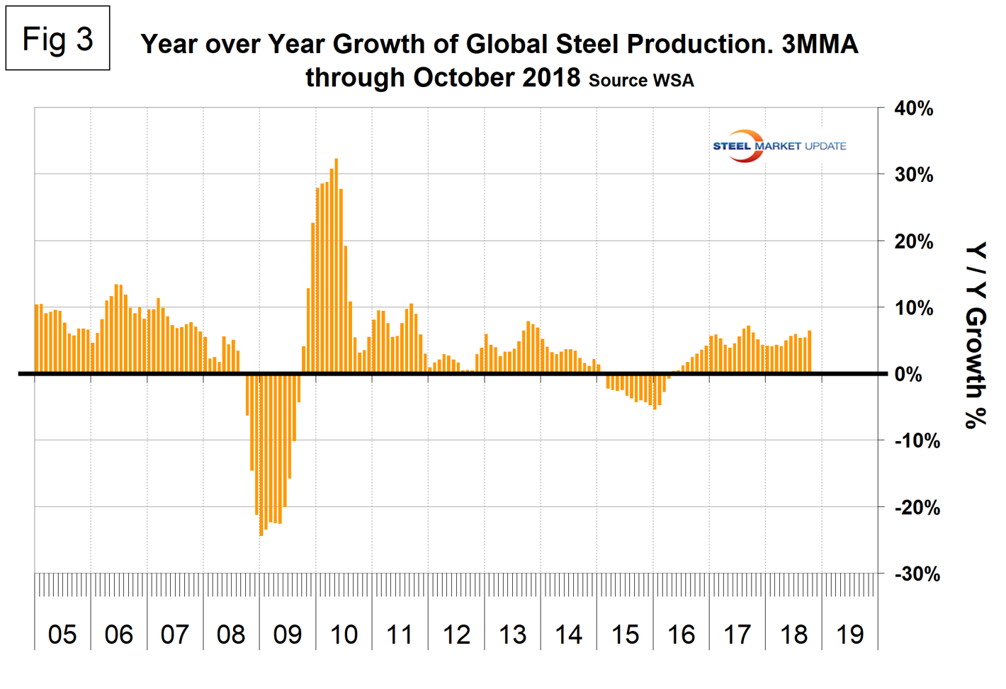 SMU Comment: Trends have been consistent in recent months as the growth of China’s steel production continues to surpass the rest of the world. It seems to us that repeated statements by those who should know about the impending cessation of China’s growth are nonsense. New plants are coming on stream and almost all of these are BOF-based, according to the August report by the OECD Steel Committee. For years now, we’ve been reading about China’s intent to reduce steel production. The remarks from the World Steel Association reported in this piece are typical. The fact is, it isn’t happening! China’s production is growing over eight times as fast as the rest of the world. In its October projection for global growth in 2018 and 2019, the IMF anticipates a 3.7 percent rate in 2019. This is well in excess of the 2.2 percent necessary to generate a continued growth in global steel demand.