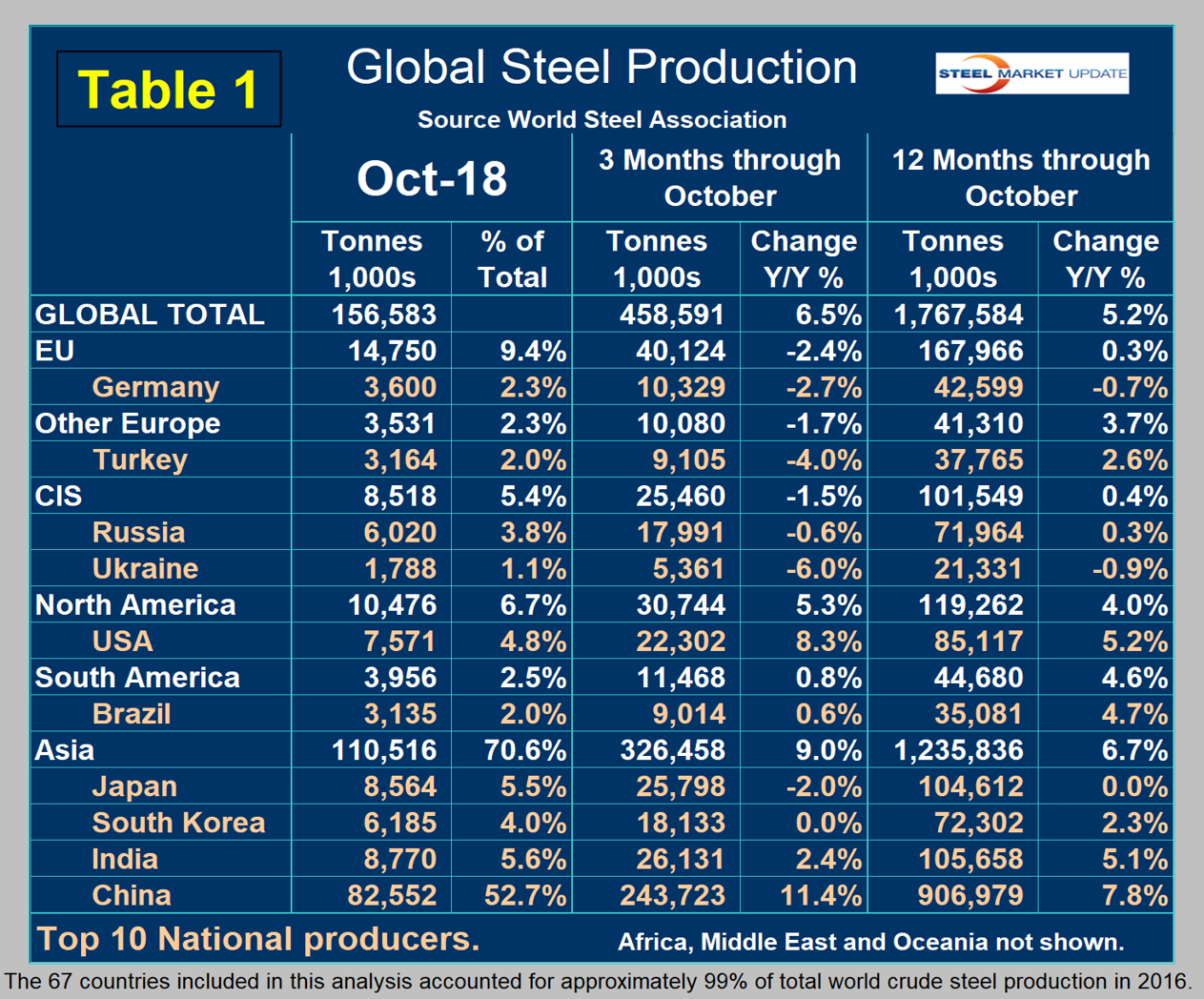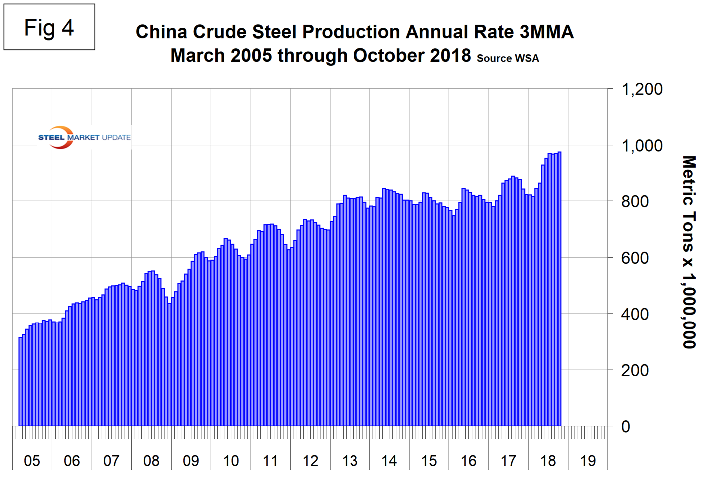 Global steel production in October hit an annual rate of 1.879 billion metric tons. Capacity is calculated to be 2.4 billion metric tons and capacity utilization in October was 78.5 percent. In three months through October, China grew by 11.4 percent year over year as the rest of the world grew by 1.4 percent. In 2018, China has increased its share of global steel production, which reached 52.7 percent in October.
