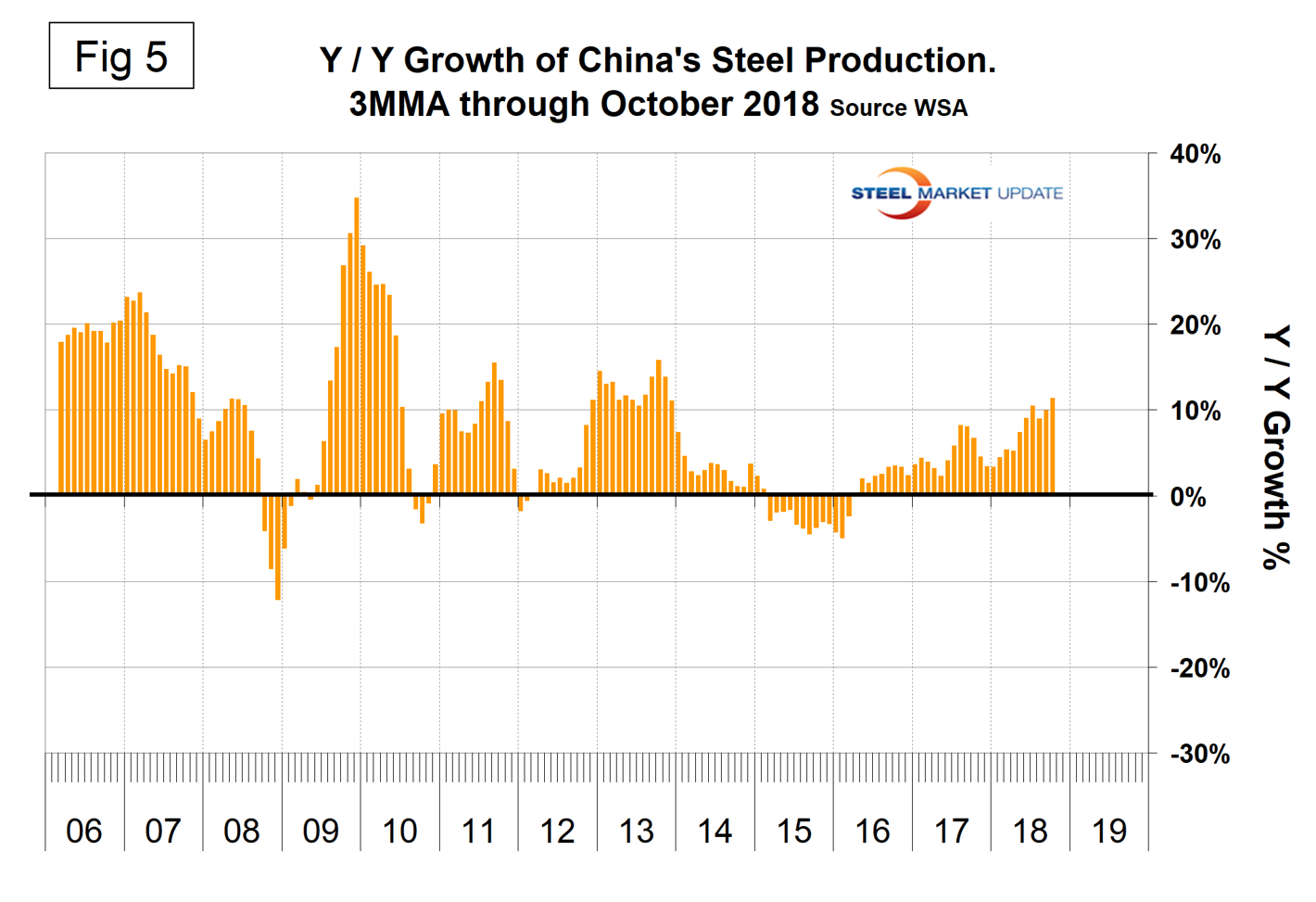 Figure 4 shows China’s production since 2005 and Figure 5 shows the year-over-year growth. China is increasingly dominating the global steel market and is approaching an annual rate of one billion tons of crude production. WSA is forecasting a deceleration in China’s steel production growth in 2019. The chairman of the World Steel Economics Committee stated recently that China is expected to experience zero growth in 2019, down from 6 percent this year, partly as a result of trade tensions with the U.S.