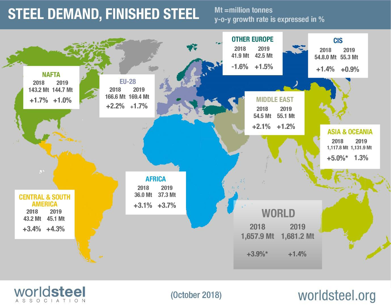 The October WSA Short Range Outlook (SRO) for apparent steel consumption in 2018 and 2019 is shown by region in the graphic below. WSA forecasts global steel demand will reach 1,657.9 million metric tons in 2018, an increase of 3.9 percent over 2017. In 2019, global steel demand is forecast to grow by 1.4 percent, reaching 1,681.2 million tons. The next forecast will be released in April 2019. (Note, the essence of this piece is crude steel production; therefore, the numbers are greater than for steel consumption, which relates to rolled products.)
