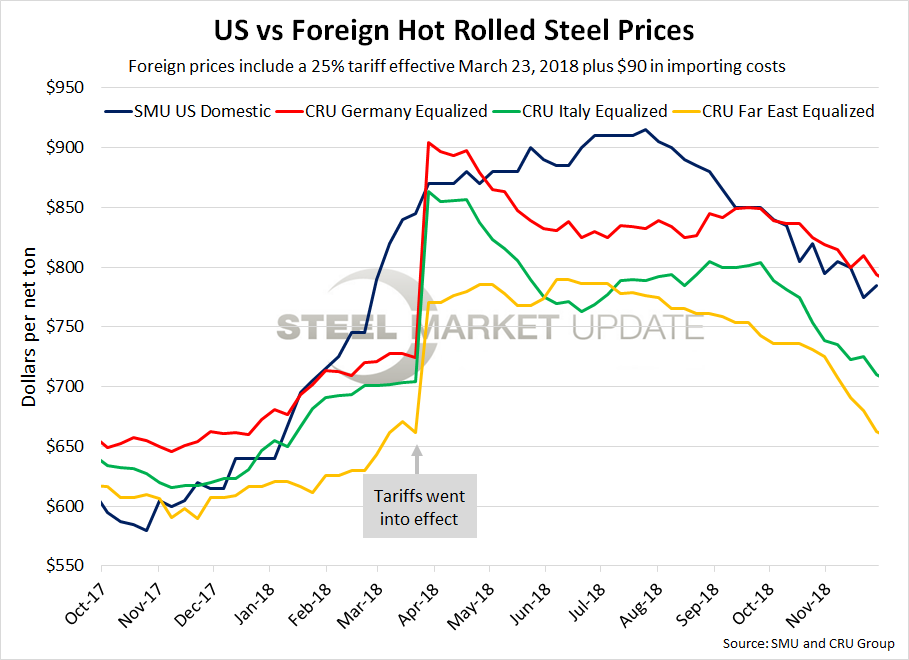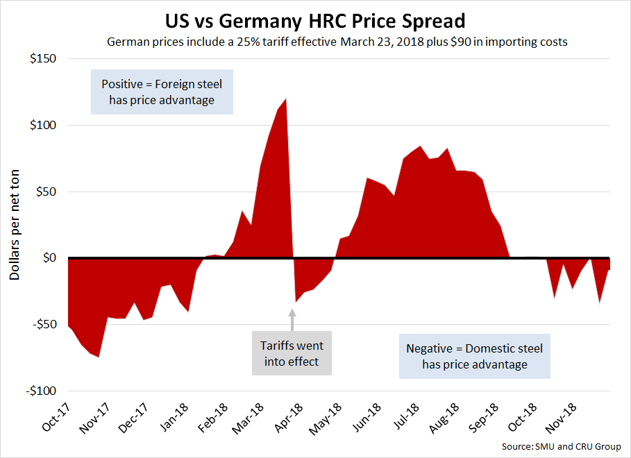 The graph below shows all four prices together and points out the effective date of the tariffs. Foreign prices are referred to as “equalized,” meaning they have been adjusted with the tariffs and importing costs for an apples-to-apples comparison against the U.S. price.
