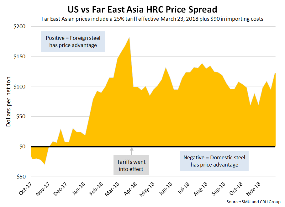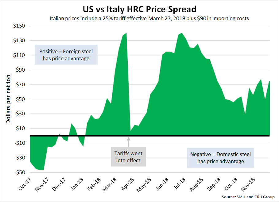 SMU now includes a 25 percent import tariff in our foreign vs. domestic price calculations, effective on foreign prices after March 23, 2018. We then add $90 per ton to the foreign prices in consideration of freight costs, handling, trader margin, etc. This provides an approximate “CIF U.S. ports price” that can then be compared against the SMU U.S. hot rolled price. The difference between the domestic and foreign hot rolled prices is then referred to as the “price spread.” As the price spread narrows, the competitiveness of imported steel into the United States is reduced. If the spread widens, then foreign steel becomes more attractive to U.S. flat rolled steel buyers. A positive spread means foreign steel has a price advantage (U.S. prices are higher than foreign prices), while a negative spread means domestic steel has a price advantage (U.S. prices are less than foreign prices). Note that we do not include any anti-dumping (AD) or countervailing duties (CVD) in this analysis.
