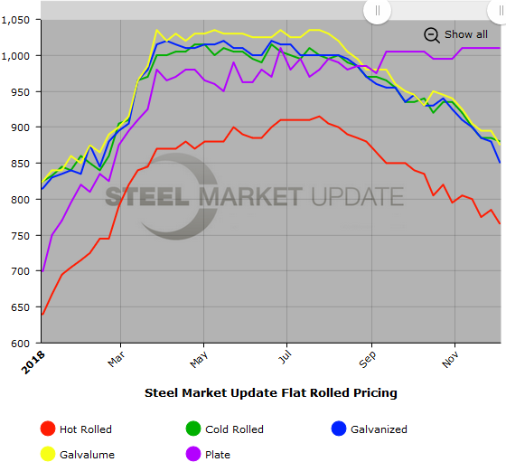 SMU Note: Below is a graphic showing our hot rolled, cold rolled, galvanized, Galvalume and plate price history. This data is available here on our website with our interactive pricing tool. Note that plate prices are not yet available on our website, but we are in the process of adding that dataset. If you need help navigating the website or need to know your login information, contact us at info@SteelMarketUpdate.com or 800-432-3475.