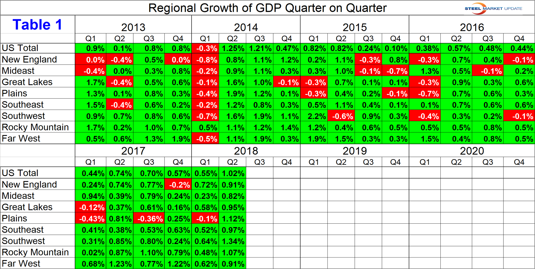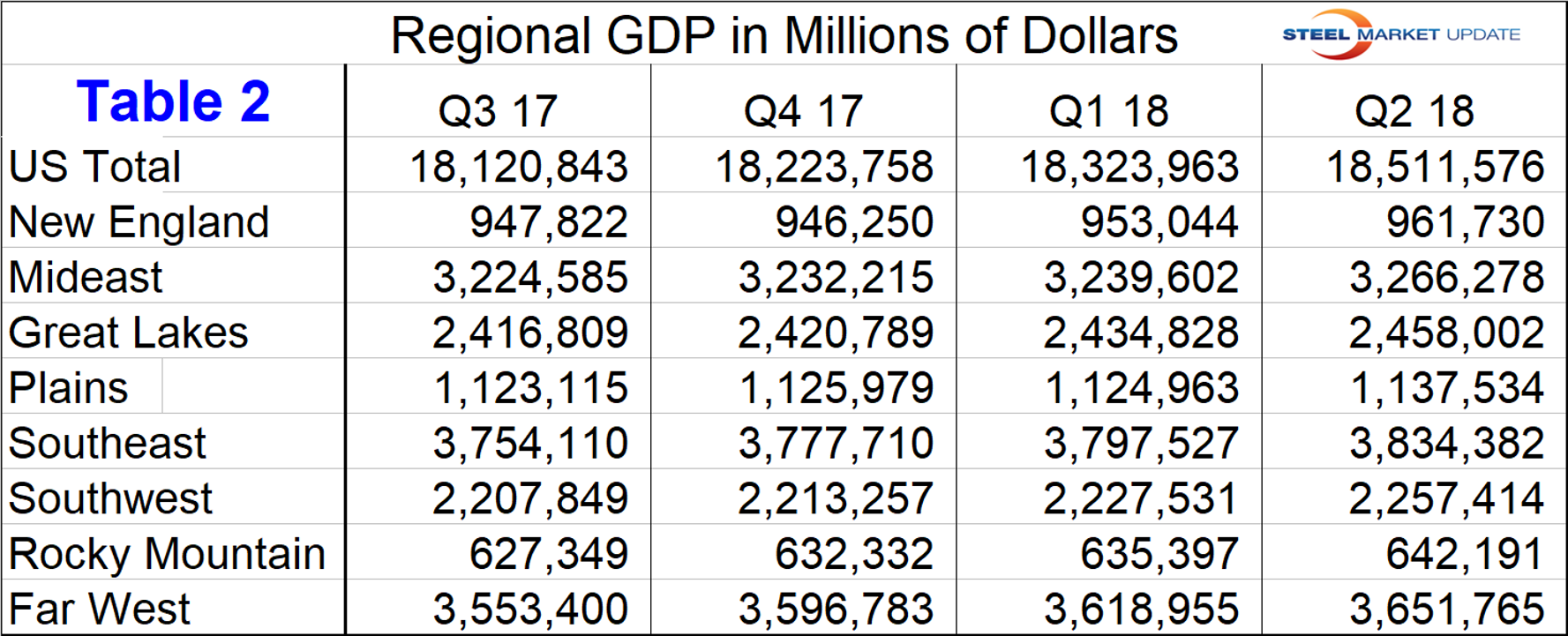 The BEA introduced a new data set for GDP by state and region in 2014 and backdated it to Q1 2005. Last week, the data was updated through Q2 2018. Even though this might be considered historically “old,” we think it’s worth reporting because it’s the foundation for where we are now. The data is published quarterly. Steel Market Update analyzes the data and reports to subscribers quarterly by region.