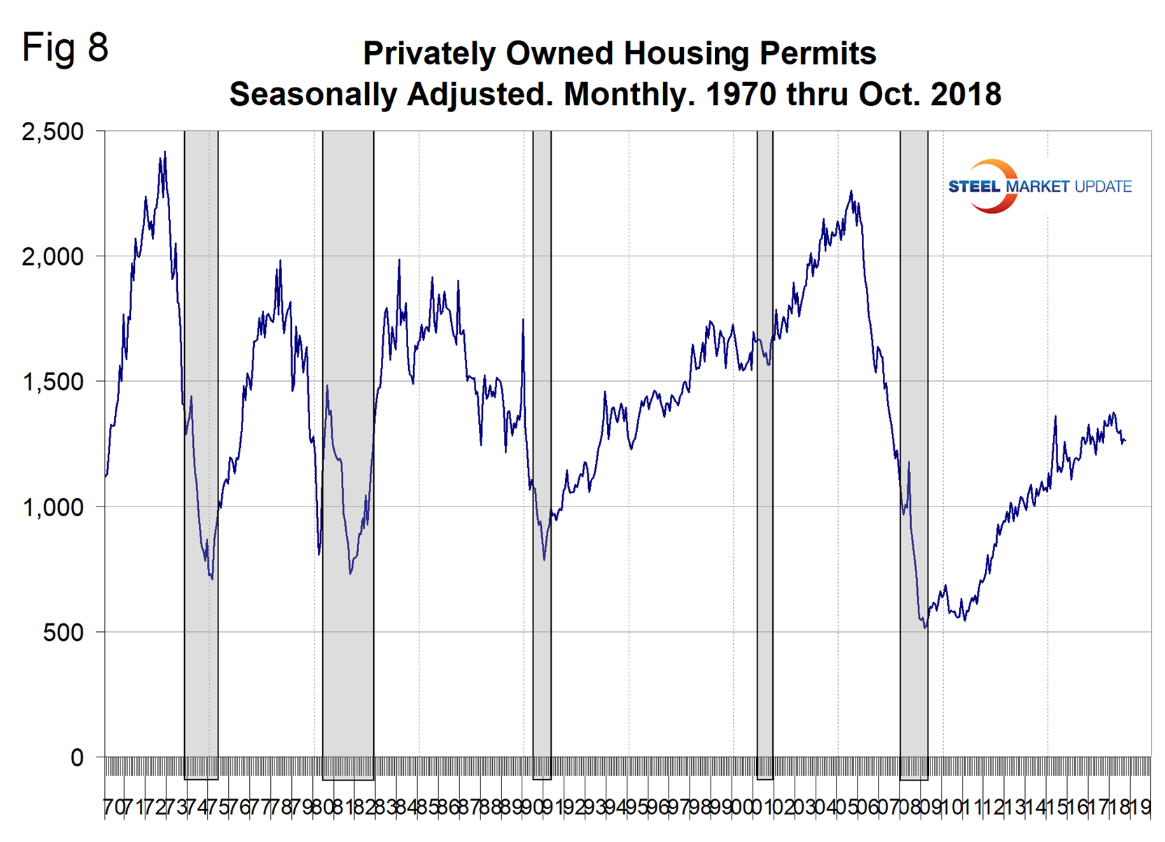 A decline in housing starts has led every recession since 1970. This seems to be a very prescient indicator. At present, there is evidence of slowing, but no sustained decline. This month, we have changed our analysis from housing starts to housing permits to try to be ahead of the game. On a year-over-year basis, growth still looks good, but in the shorter term the predicted slowdown is beginning to appear (Figure 8).