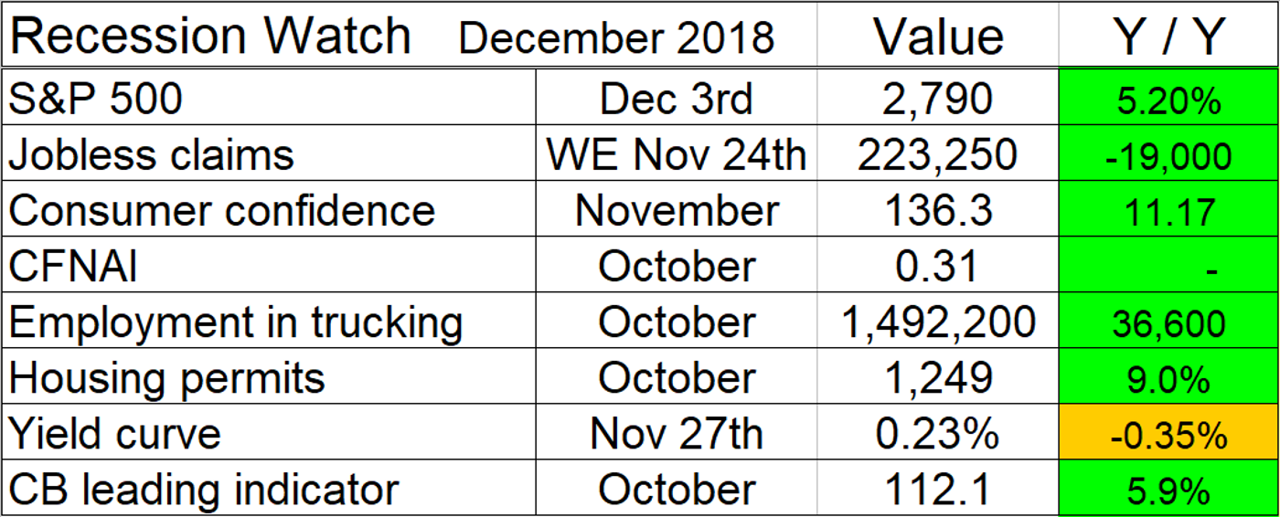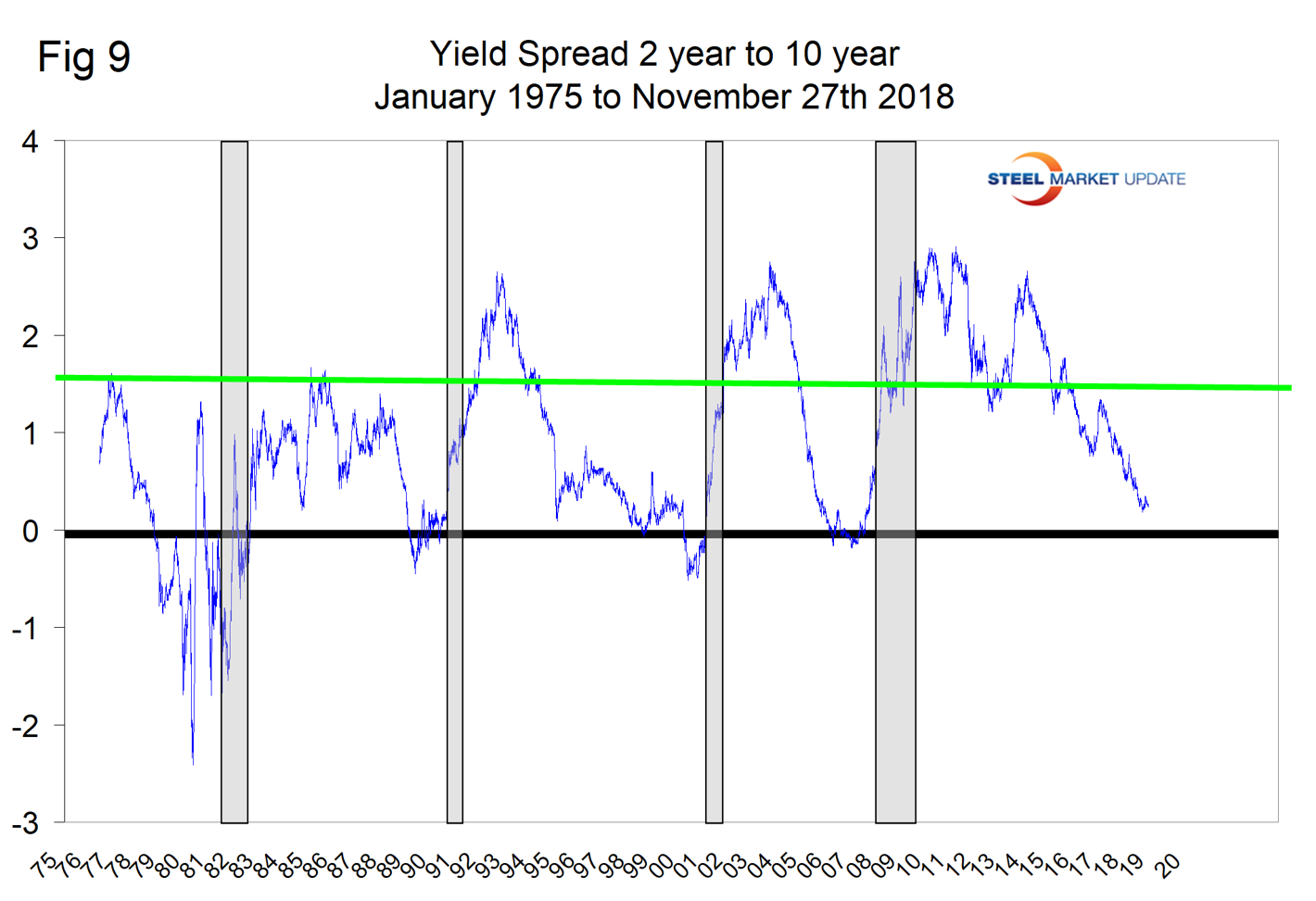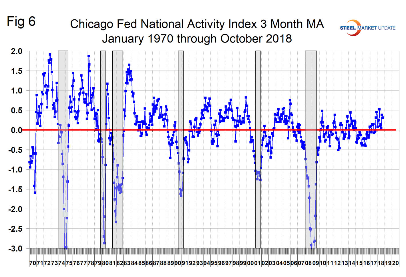 Steel Market Update has been producing this report every three months. We are now increasing the frequency to two months as the pundits are discussing the timing of the next recession. Also, we have expanded our analysis to include the Chicago Fed’s National Activity Index and employment in truck driving. Economists consider recessions to be a necessary evil to clear out distortions that have arisen in the economy. Viewed individually, the leading indicators that we track offer limited insight into future economic expansion or contraction. Viewed collectively, they give subscribers a better idea of present and future business activity. Since World War II, most recessions have been preceded by an overheated economy as indicated by low unemployment, tighter monetary policy and rising long-term interest rates.