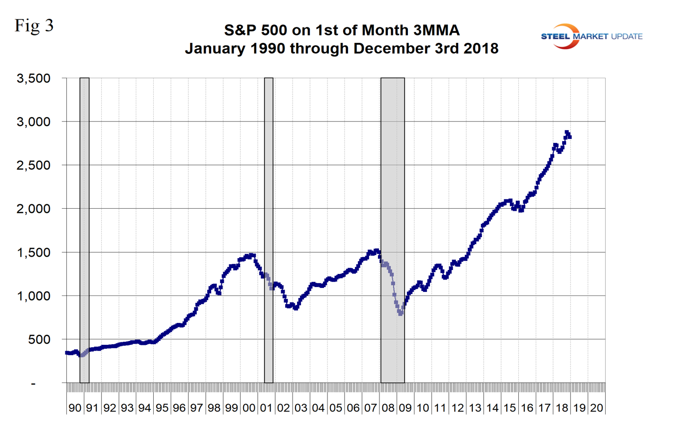 Figure 3 shows the three-month moving average of the S&P 500 on the first day of each month from January 1990 through December 2018. The stock market did predict the recession of 2001, but failed in 2008. Since then, there have been several blips that proved of no significance. The tendency is that stock prices decline as investors anticipate a weakening economy and flagging corporate earnings. Fed tightening is also a factor in 2018.