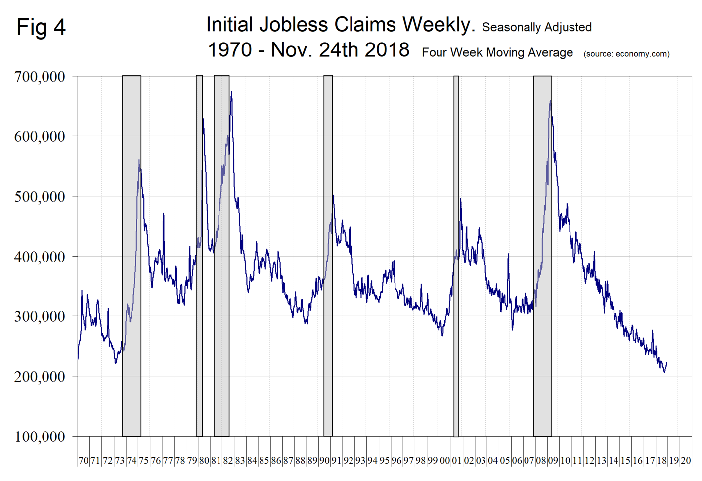 Figure 4 records new weekly claims for unemployment compensation. This indicator failed to predict the 1981 and 2008 recessions. It had a lead of over a year on the other four. Initial claims for unemployment insurance, reported weekly, are a sensitive measure of layoffs. Initial claims are currently at a 50-year low.