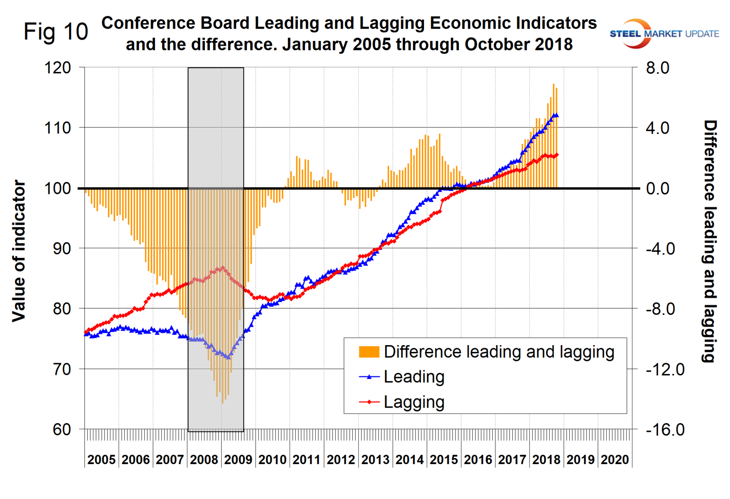 Figure 10 is the chart we like the best, though we have no history before 2008. This is The Conference Board leading and lagging economic index. We have subtracted one from the other in the rationale that if the lead is better than the lag, the situation is improving, or vice versa. The lead minus lag inverted three years in advance of the 2008 recession; certainly by 18 months before the big event it was clear something was happening. Through October, the spread was very healthy and has been widening for almost two years.