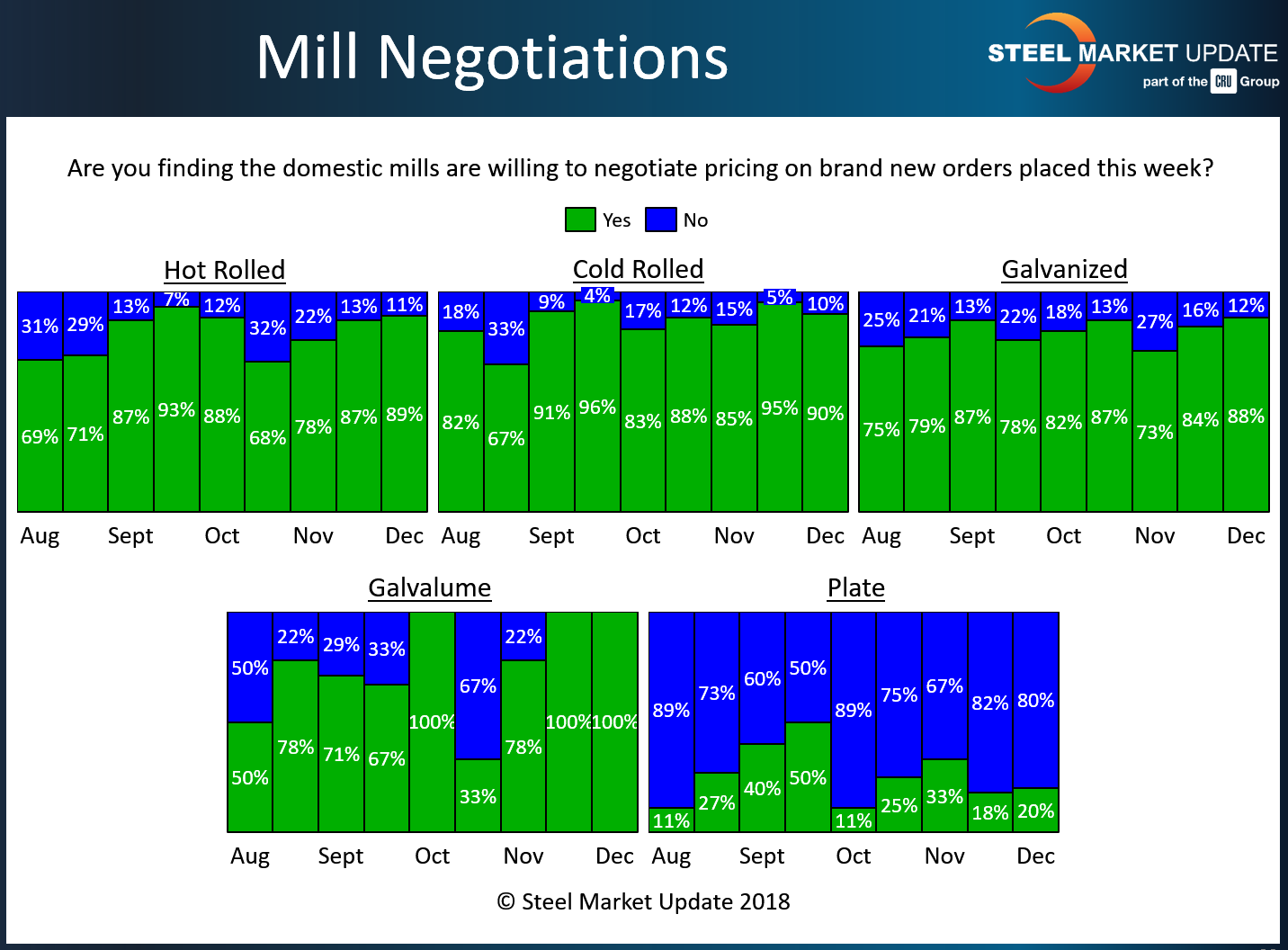 Steel Market Update tracks how buyers and sellers of flat rolled and plate steel characterize price negotiations with the mills. About nine out of 10 respondents to SMU’s latest market trends questionnaire report that the mills are open to price discussions on hot rolled, cold rolled, galvanized and Galvalume steel products.